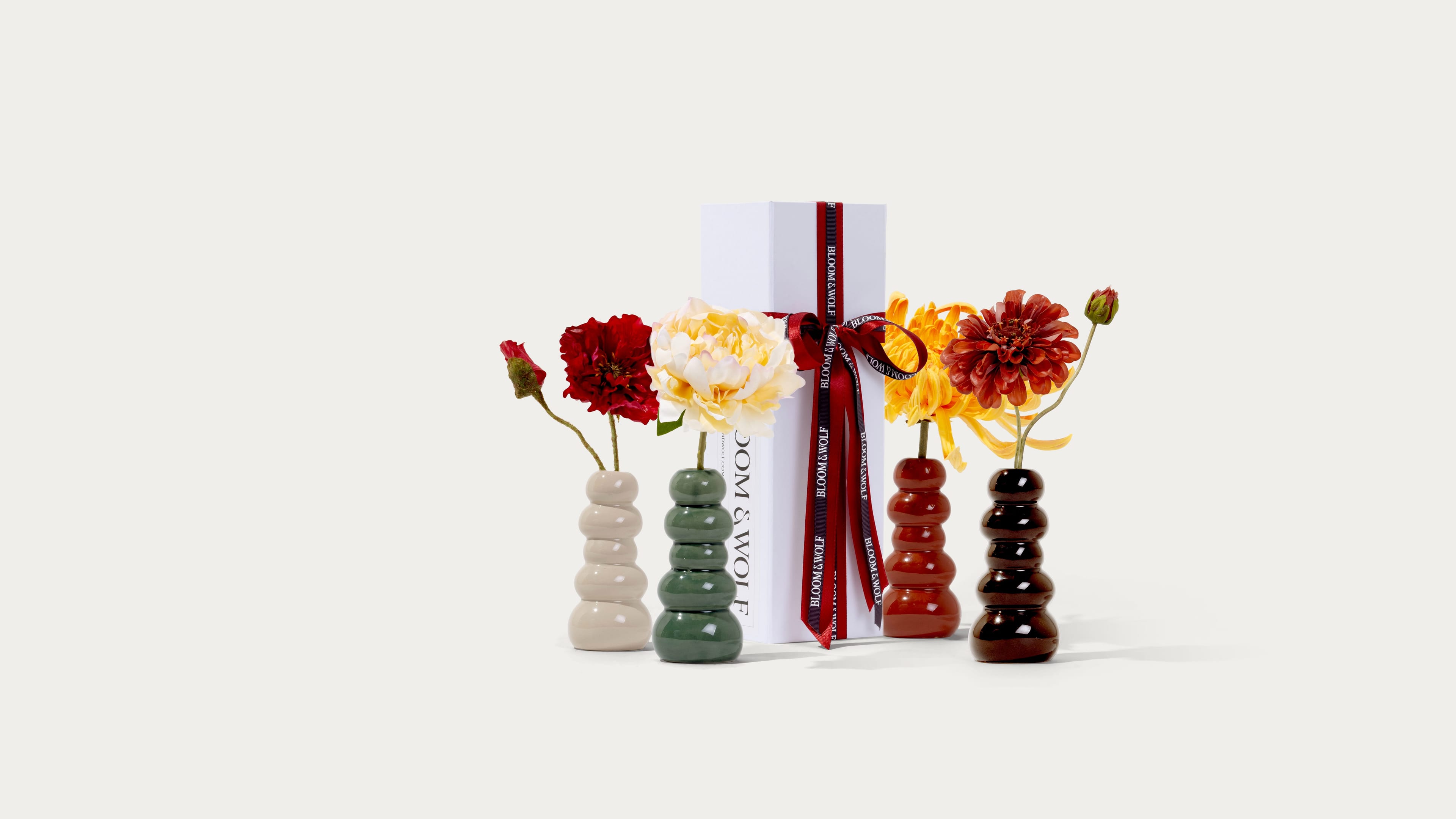 Giftboxes: At Bloom & Wolf, gifting has never been easier or more special. Our special gift boxes are the perfect way to share love and joy this holiday season. Choose two mini flowers of your choice, beautifully packaged in a ribbon-wrapped box with a handwritten card and our signature perfume.