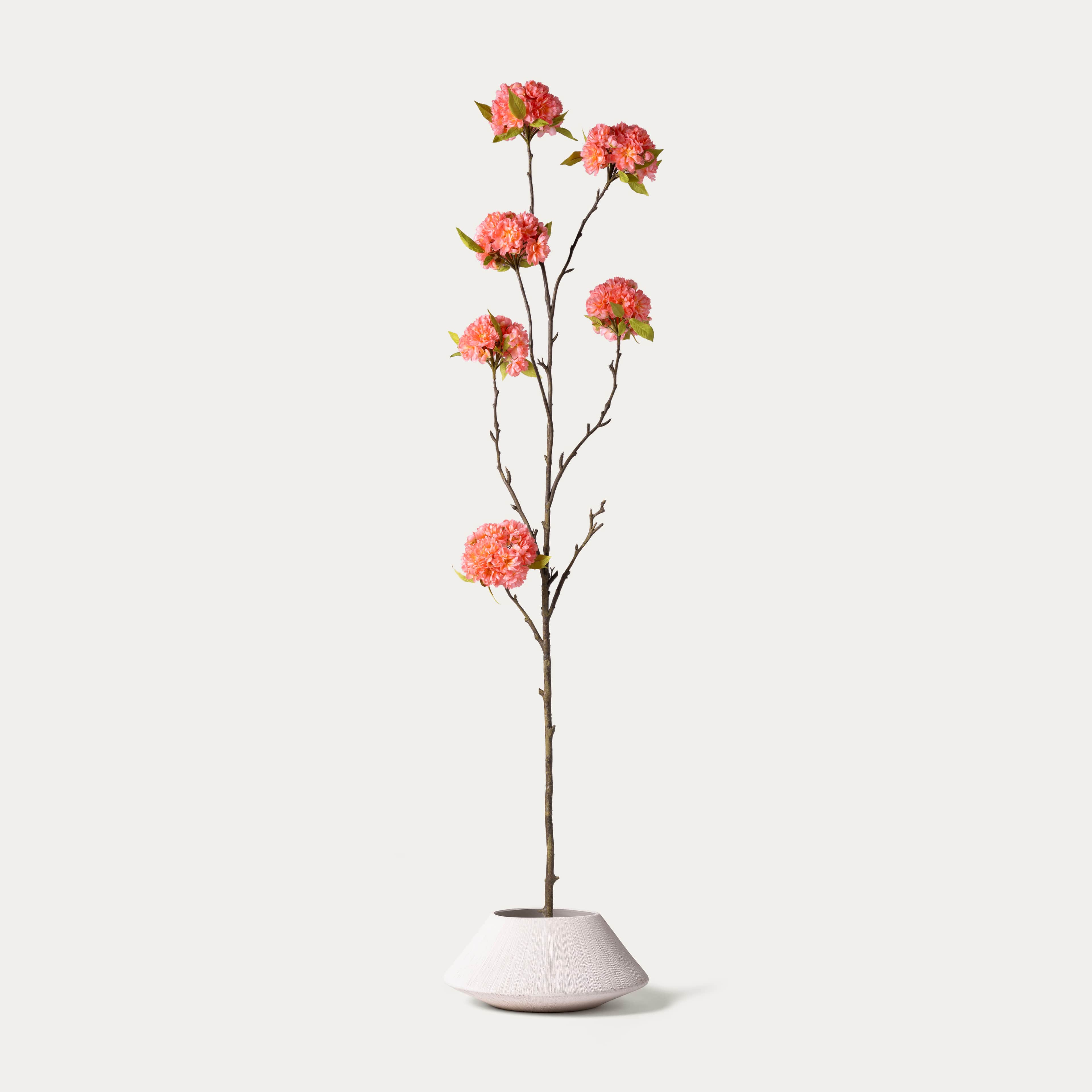 A dreamy masterpiece featuring lush peach-colored blossoms in an organic beige vase.