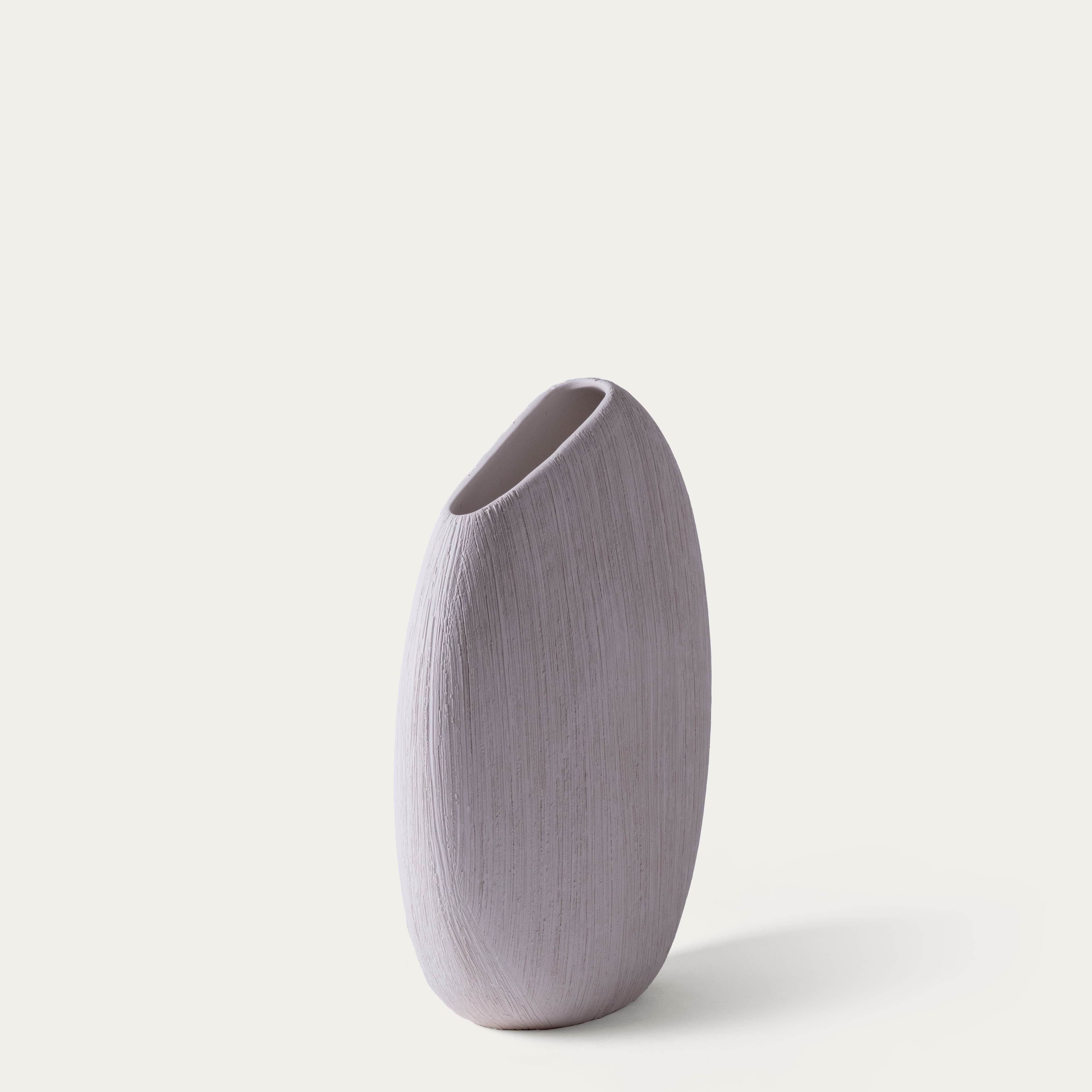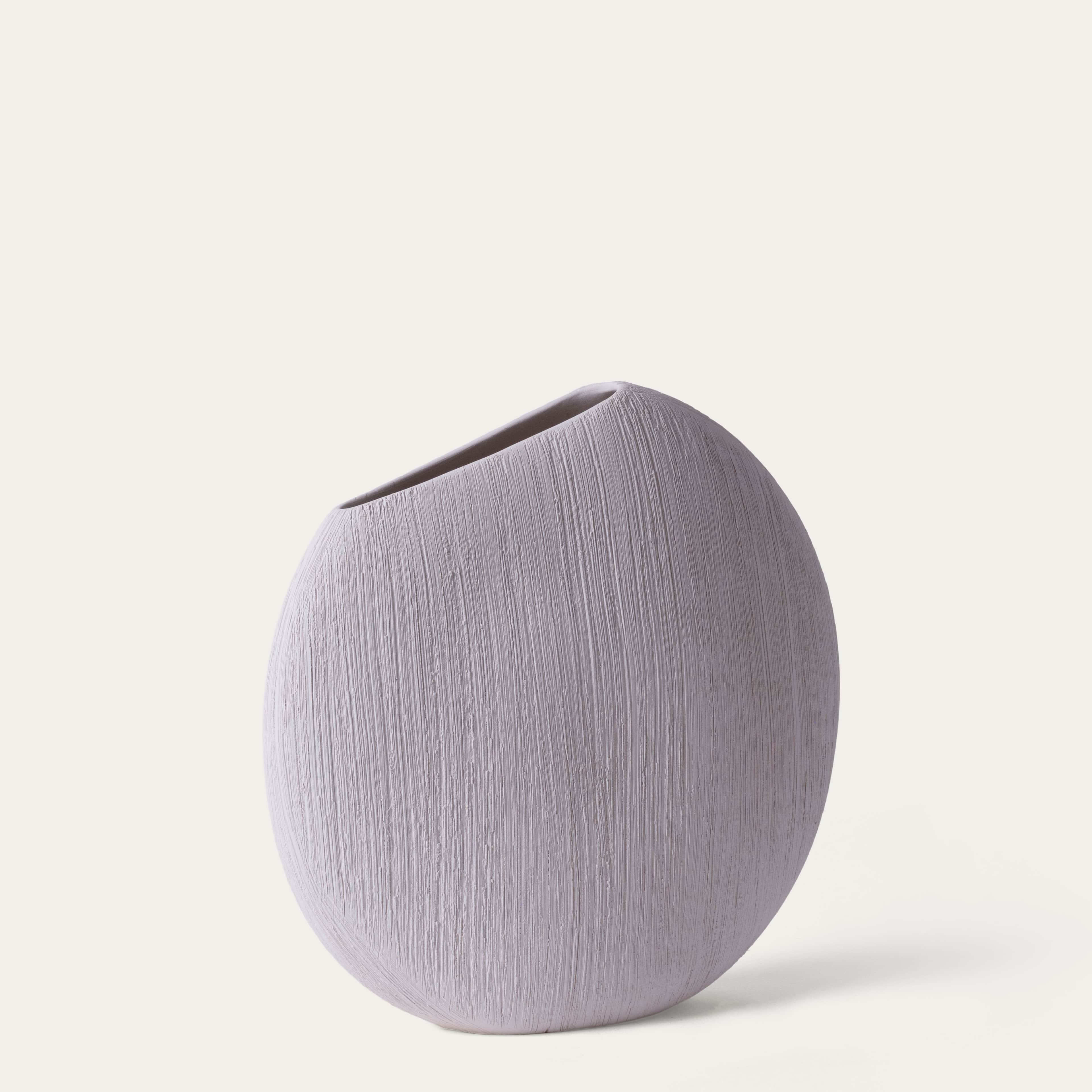 A cream disc vase with a soft matte finish. Understated and elegant, perfect for a low bouquet.