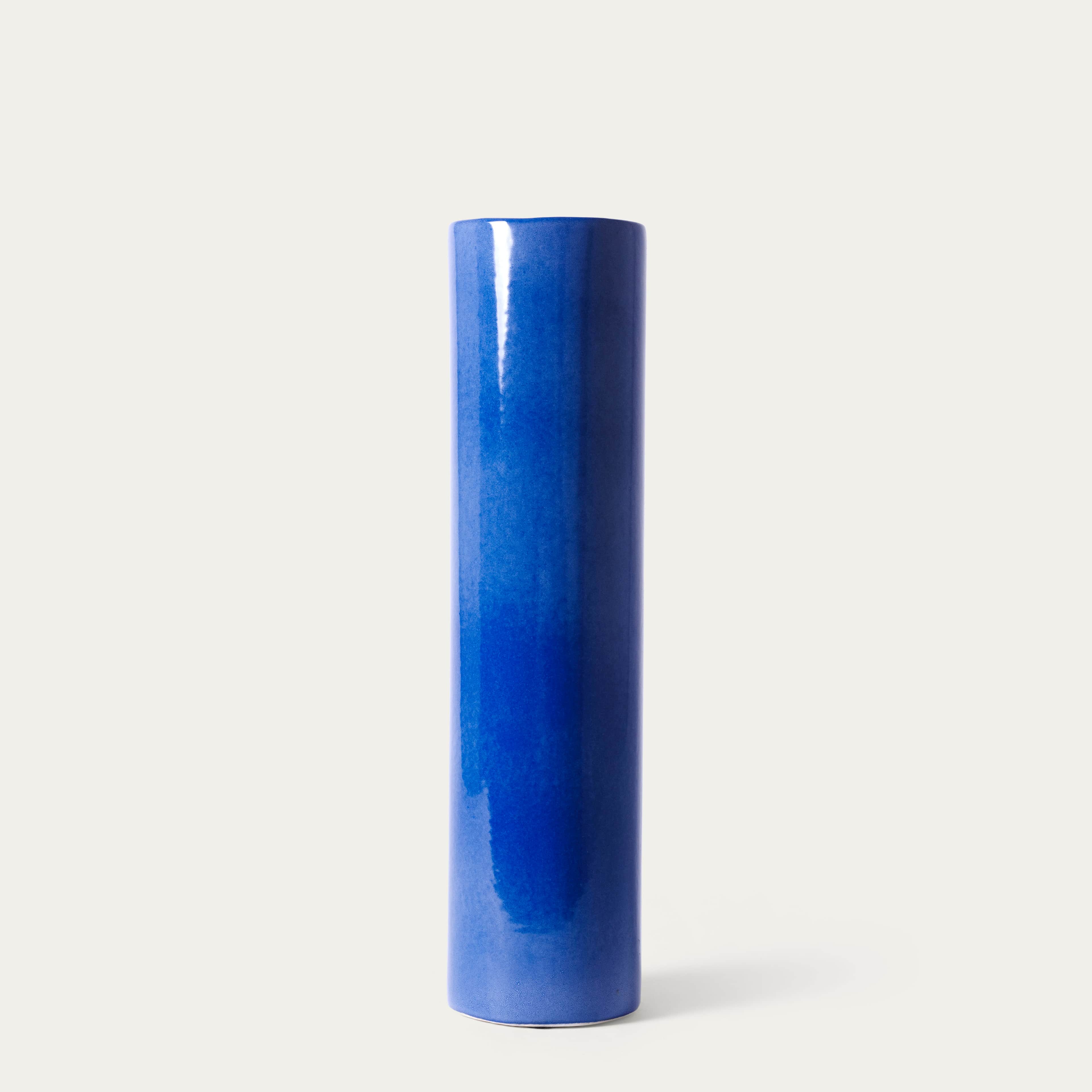 A tall, narrow vase in deep blue. Timeless and calm; a beautiful base for vibrant flowers.