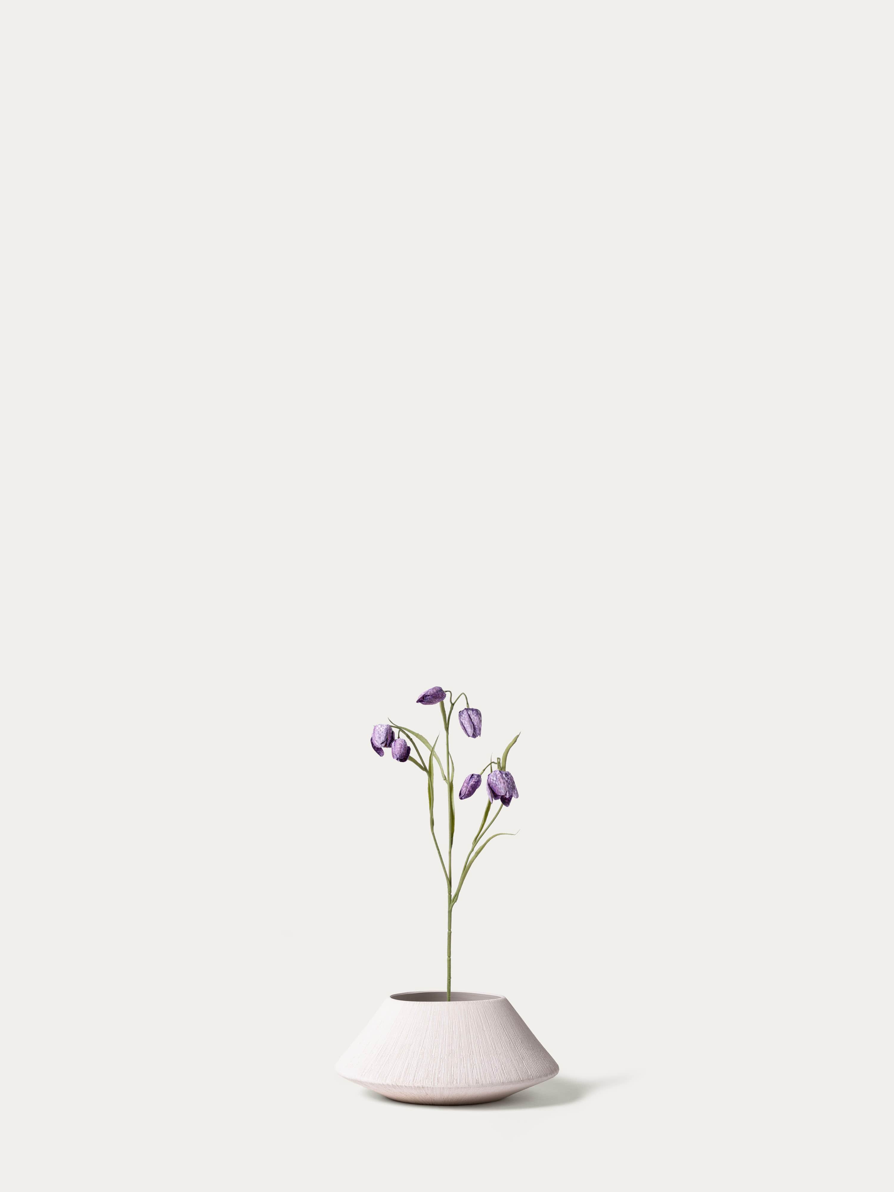 A dreamlike silk blend of real-touch yellow dahlia, pink poppy, and purple fritillaria in an organic ivory vase. The bouquet comes with our complementary floral scent.