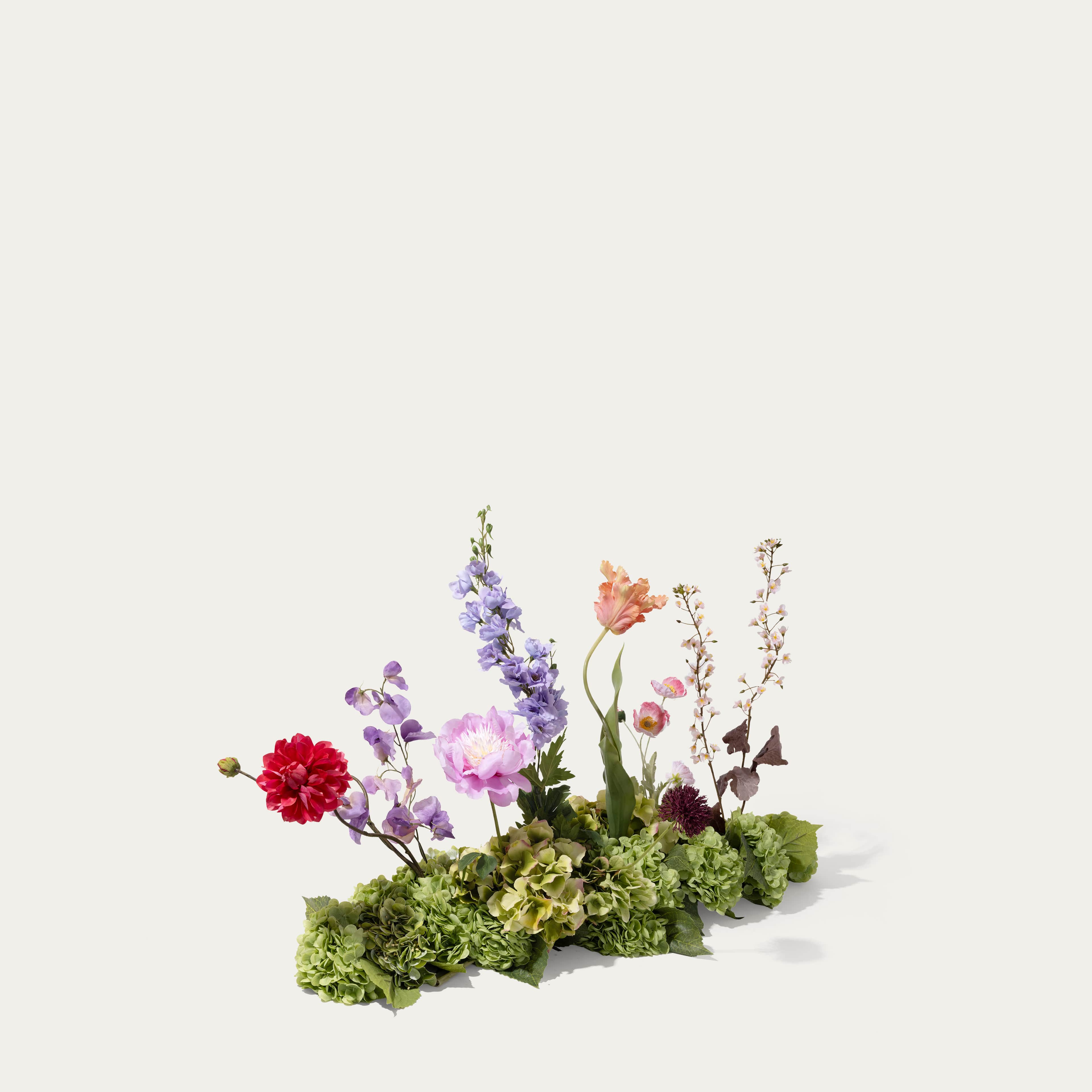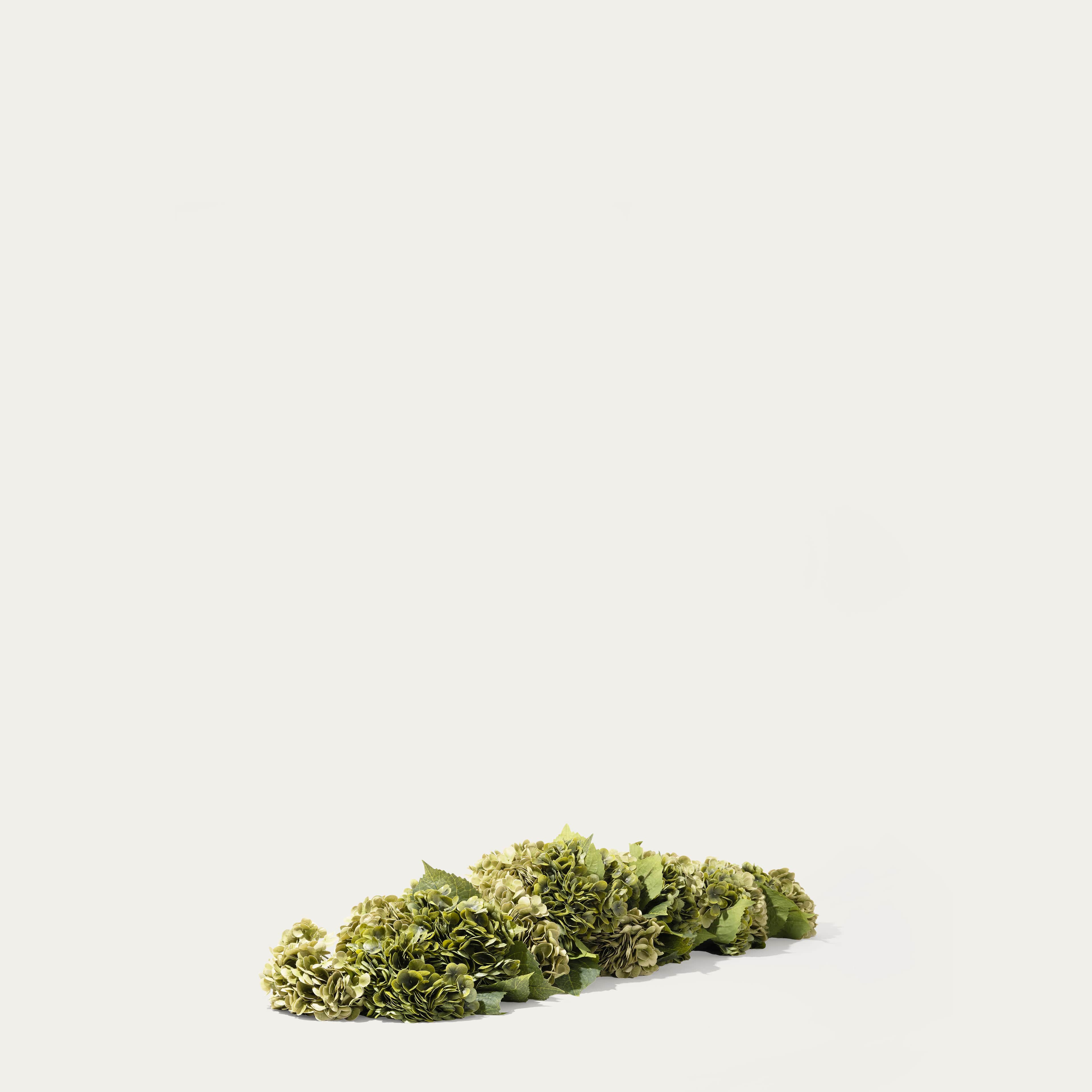 A lush centerpiece of green real-touch hydrangeas: timeless, full, and effortlessly elegant. Beautiful on its own, or enrich it with a few single stems for a personal touch. The arrangement comes with our complementary floral scent.