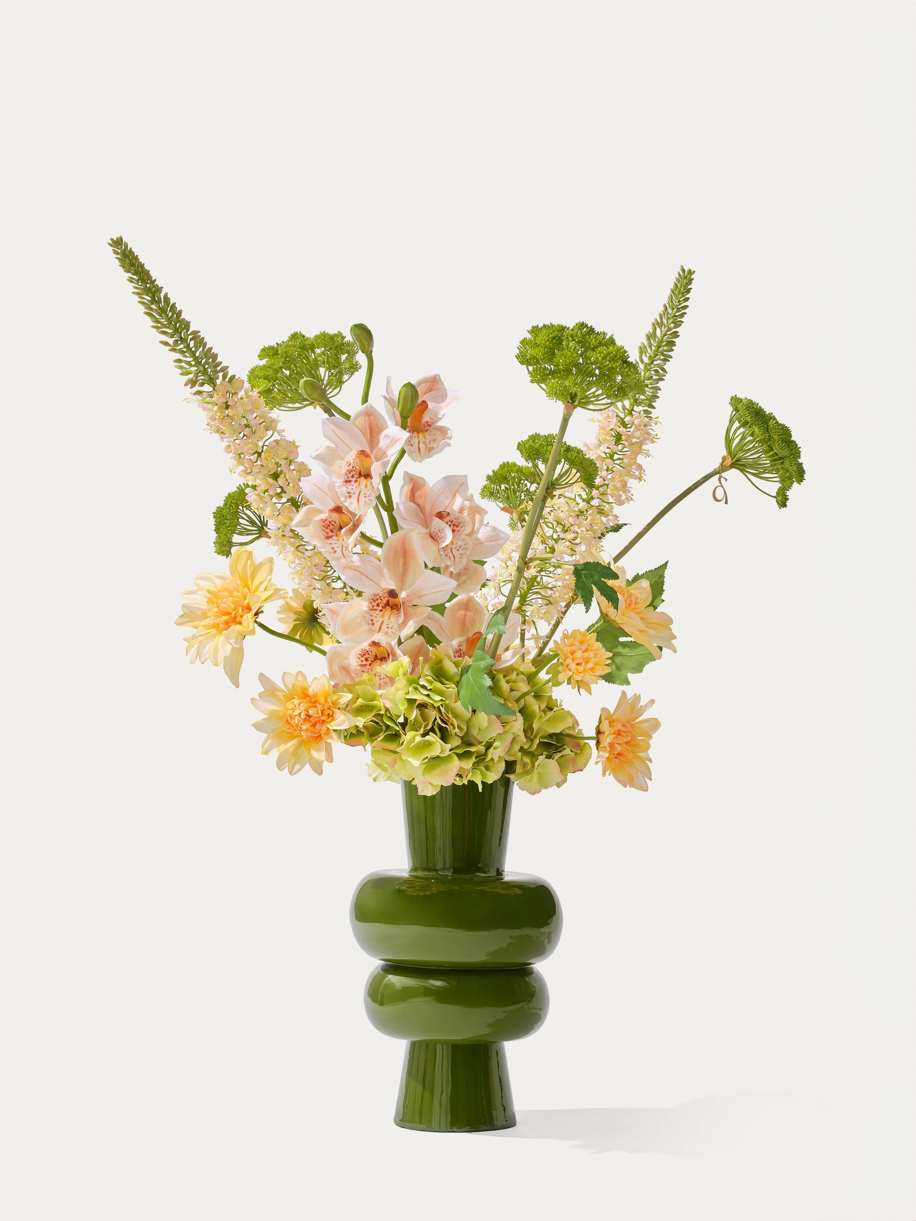 This bouquet of silk symbidium orchids, Japan weed, and wild angelica gracefully dances in a curvy stone vase.