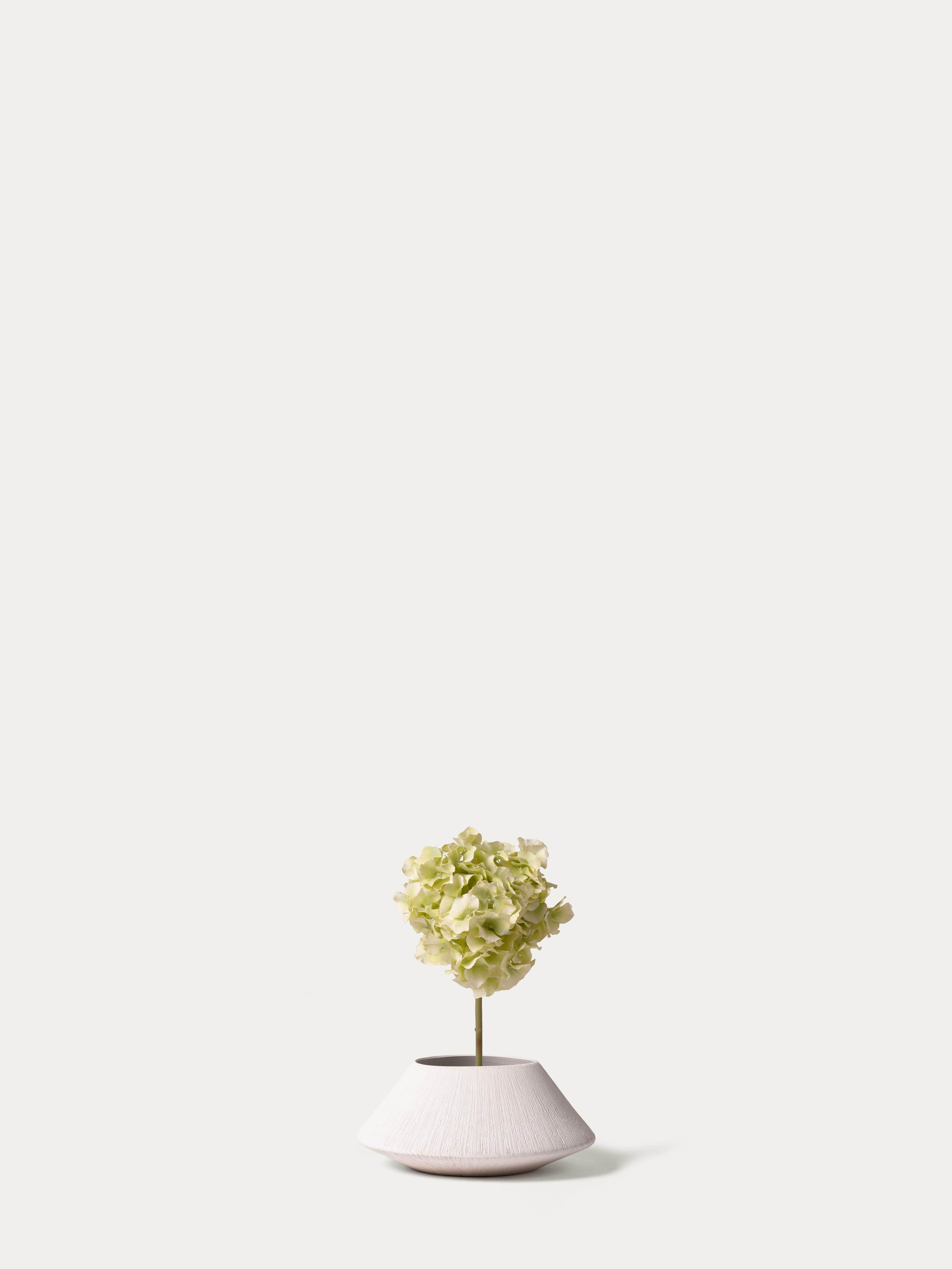 This bouquet of silk symbidium orchids, Japan weed, and wild angelica gracefully dances in a curvy stone vase.