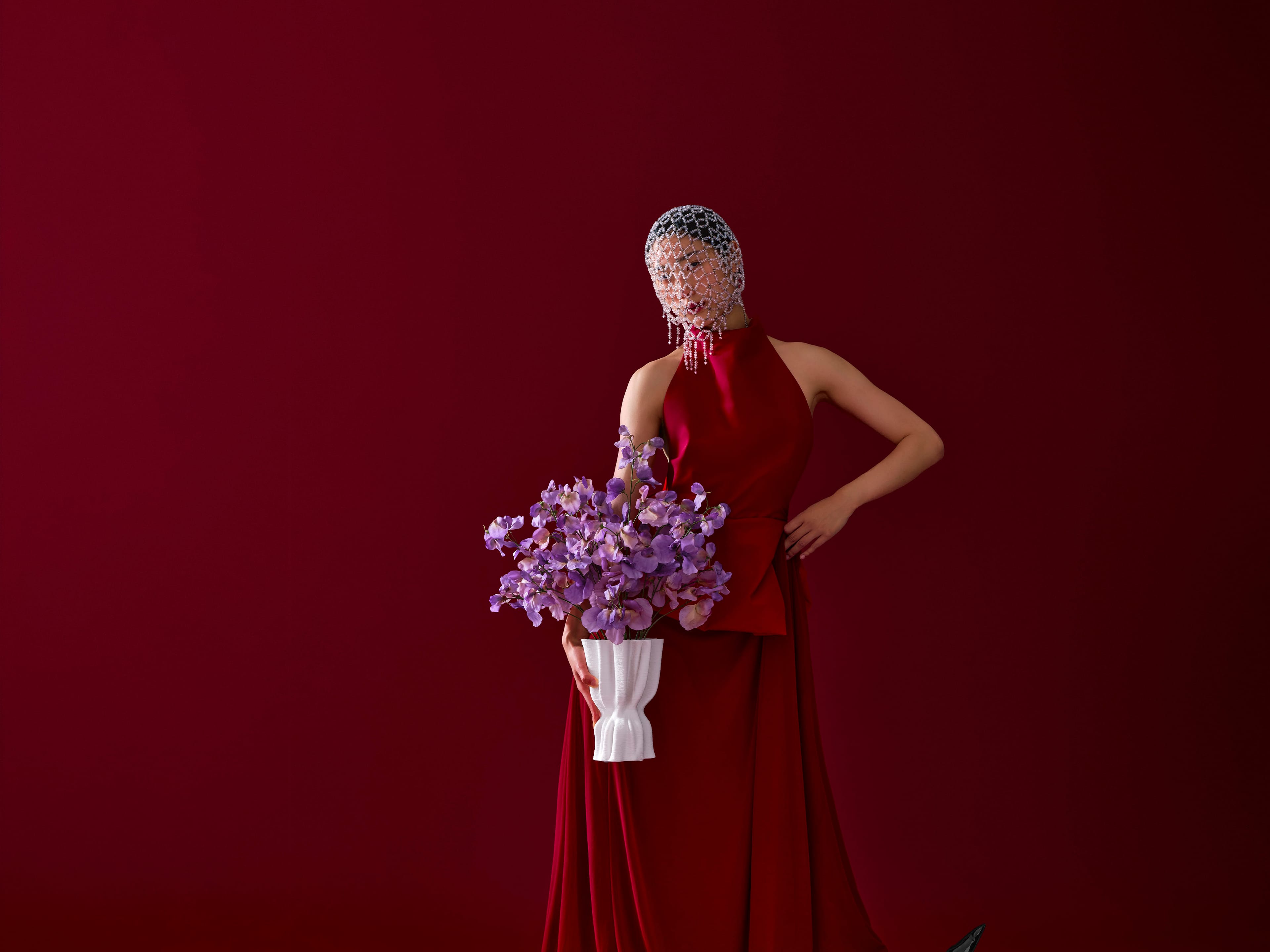 Elegant mono bouquet of silk lilac sweet pea in an organically shaped cream vase.