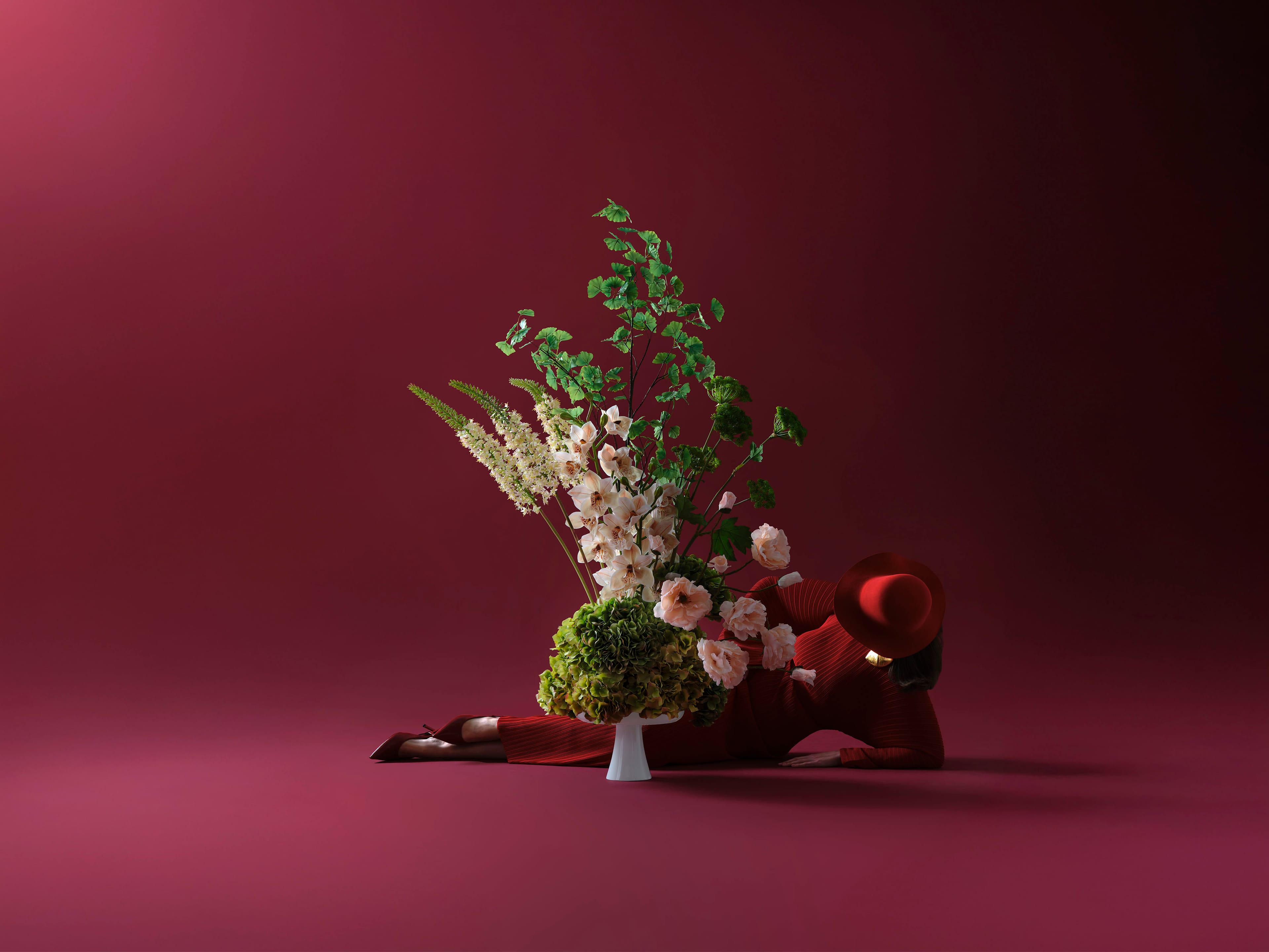 Our signature sculpture featuring gorgeous silk hortensias, soft pink poppies, genkgo, eremurus & nude cymbidium.