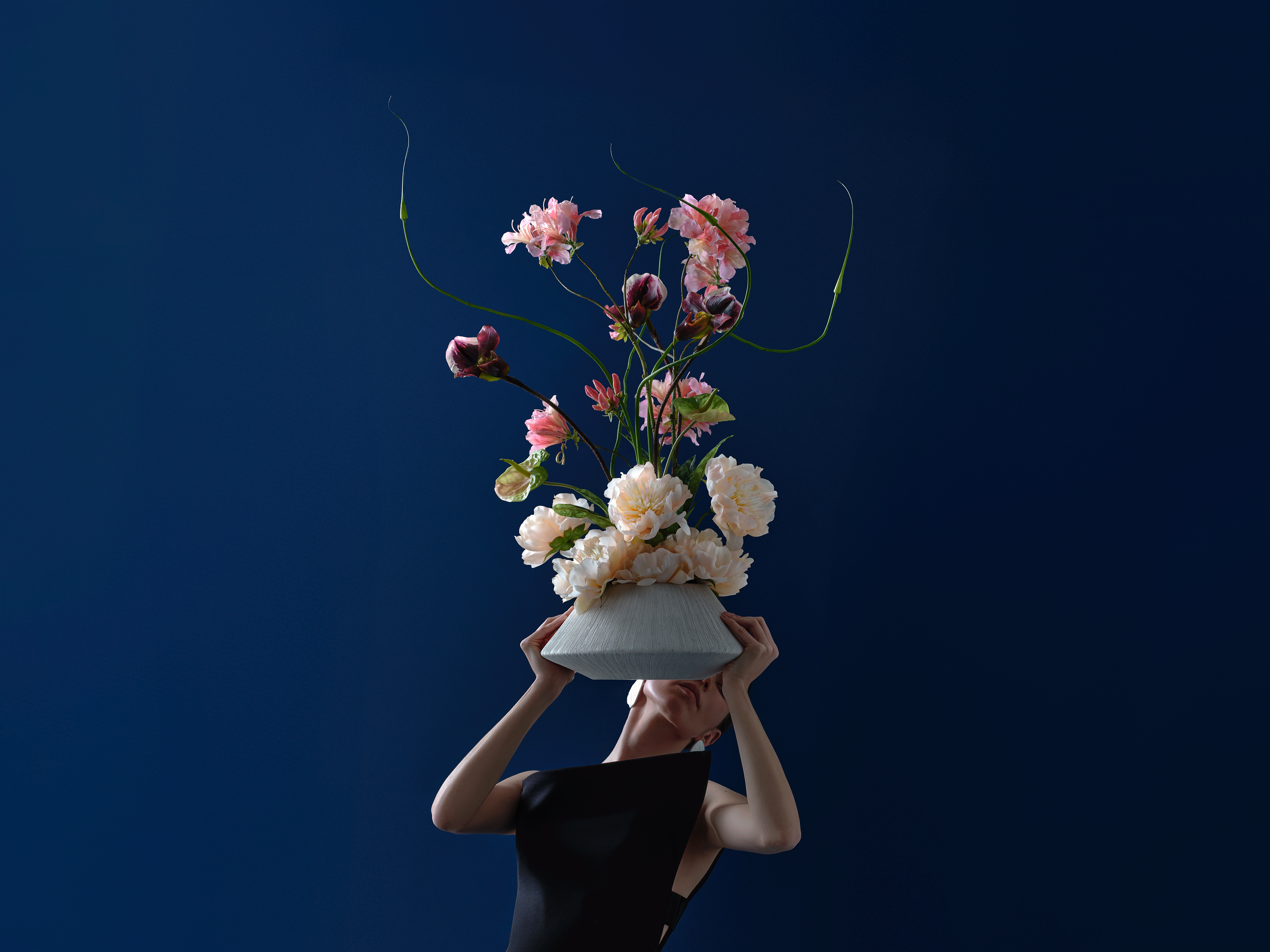 A true masterpiece! This mesmerizing sculpture features burgundy silk orchids, blooming peonies, and pink rhododendron. This bouquet comes with our complimentary floral scent.