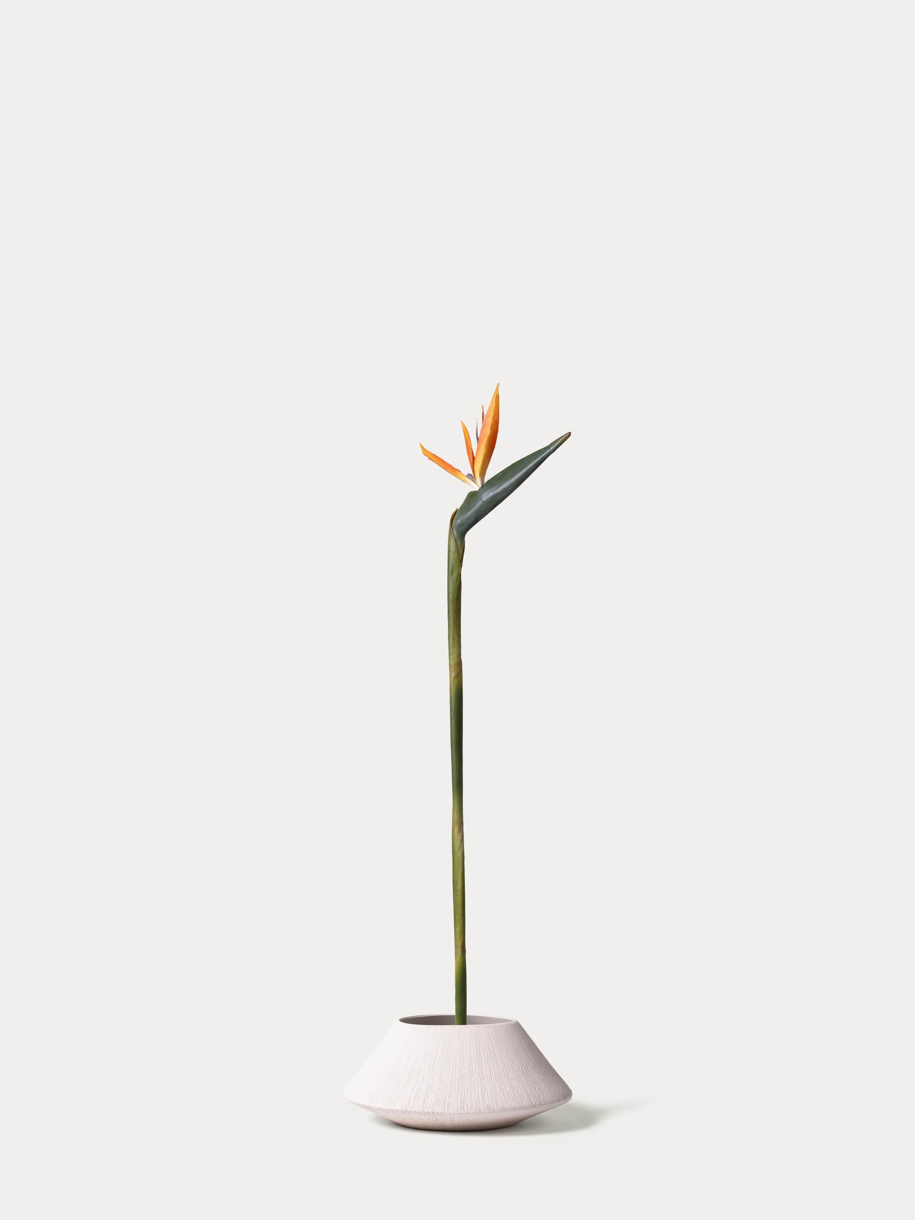 A geometric mix of silk crane flowers in a blue cylindrical vase. The bouquet comes with our complementary floral scent.