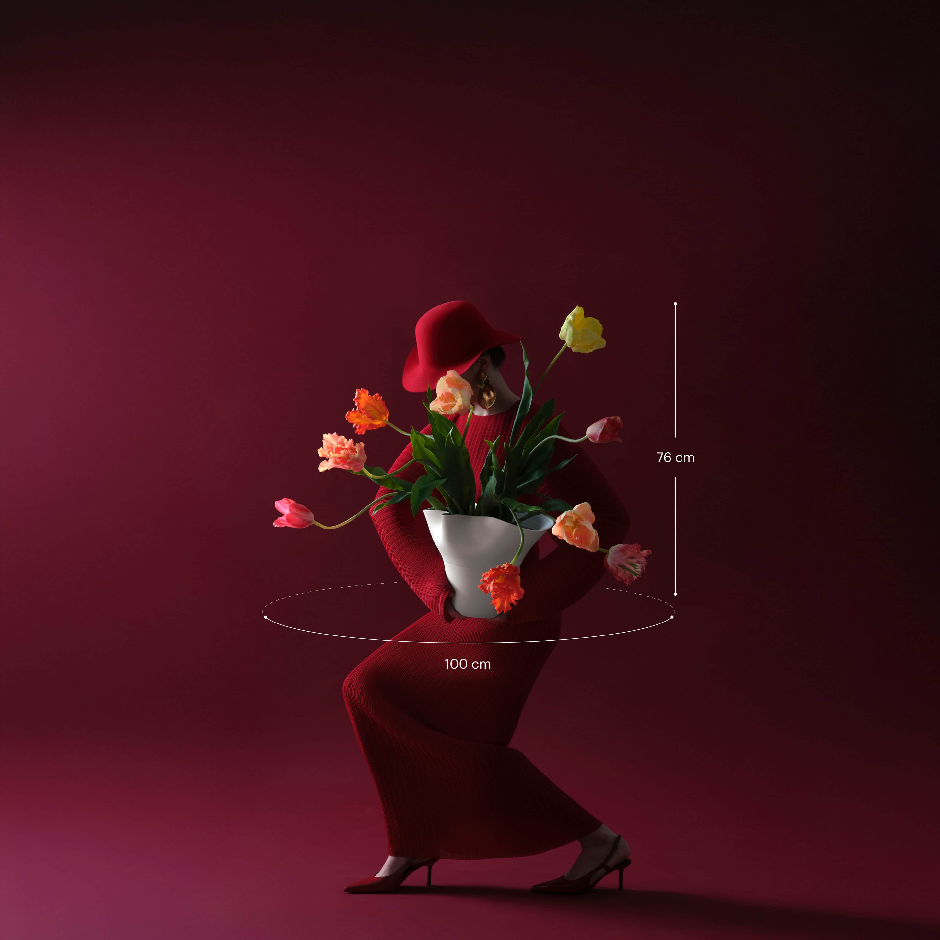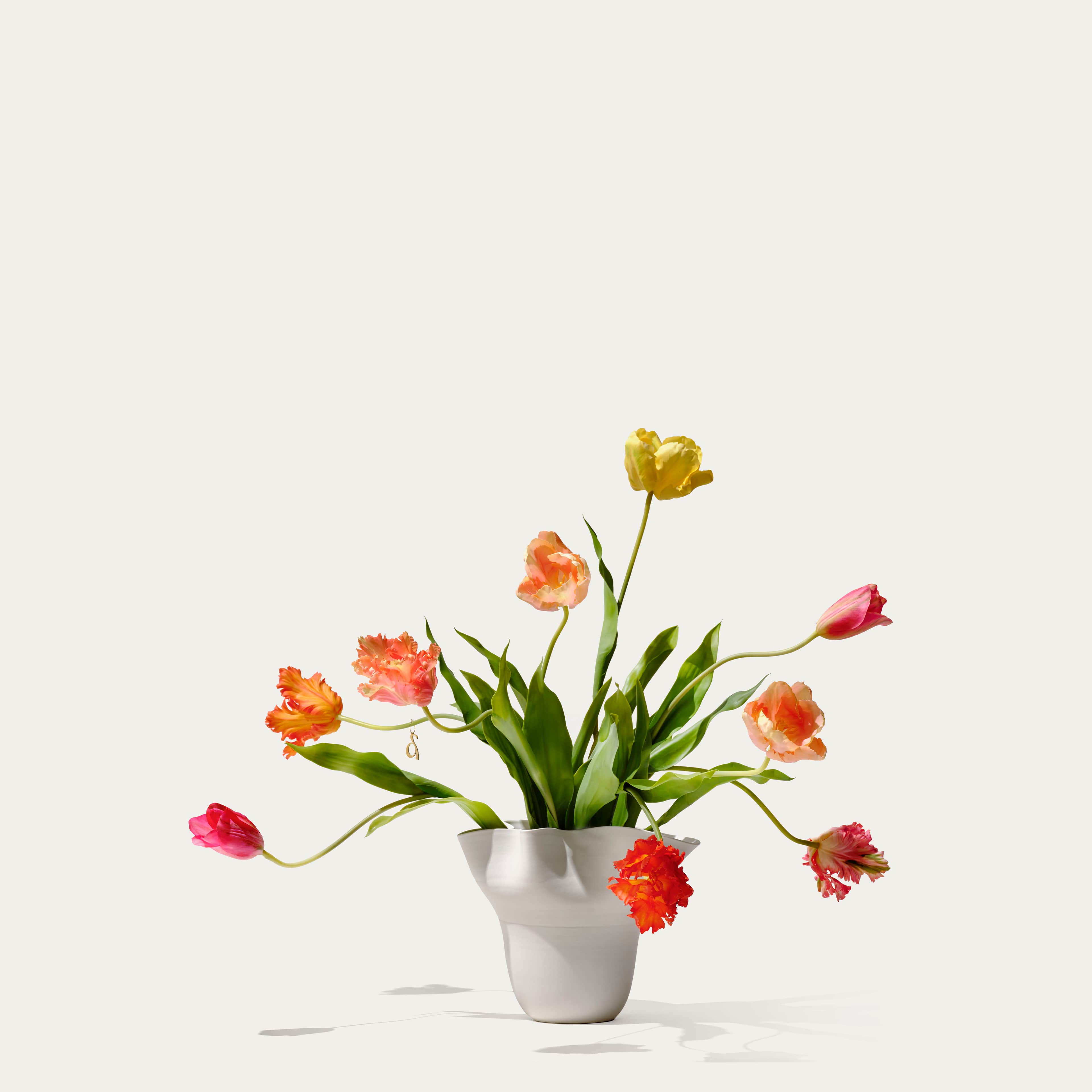 This artful tulip bouquet is a playful ensemble with its white curvy vase. This bouquet comes with our complimentary floral scent.