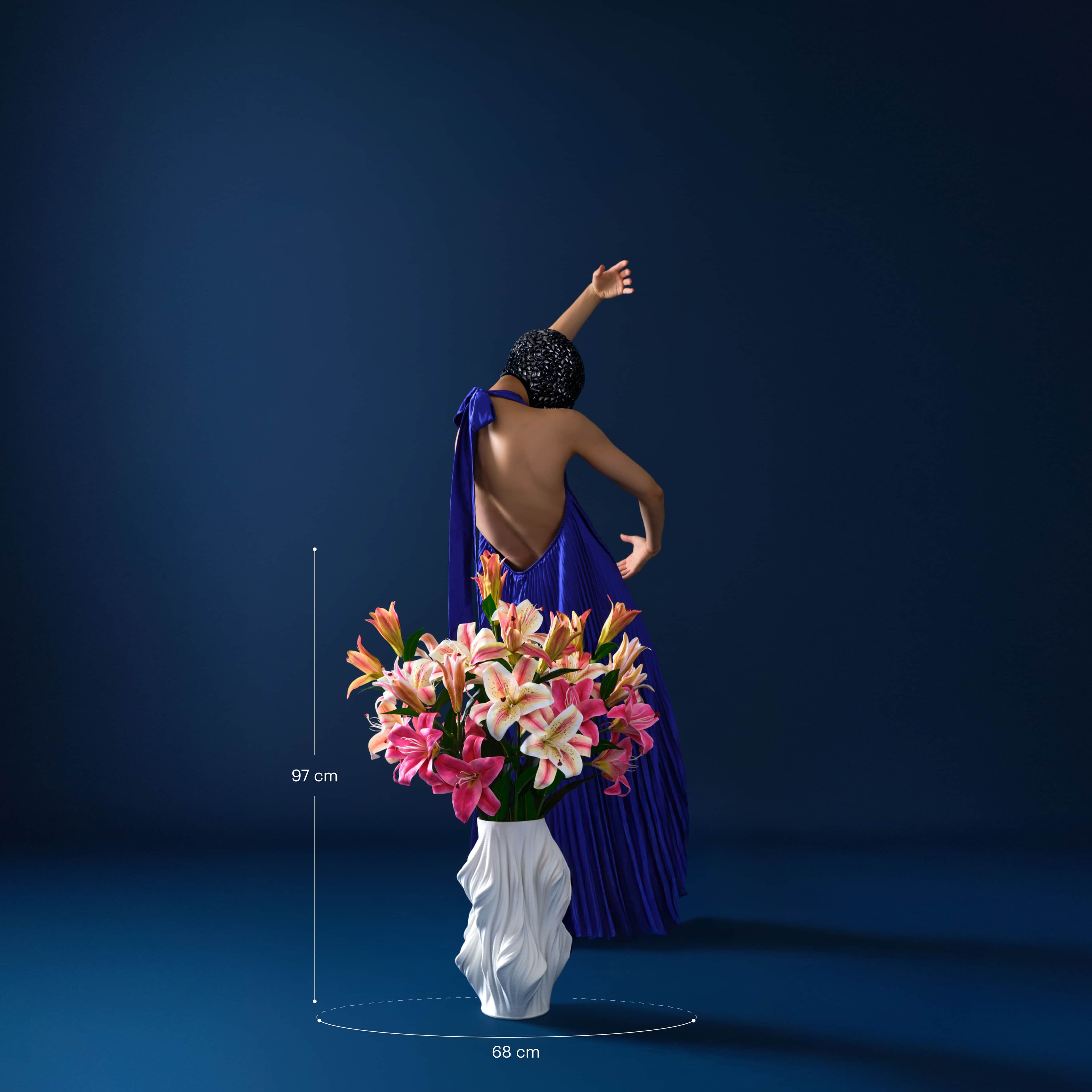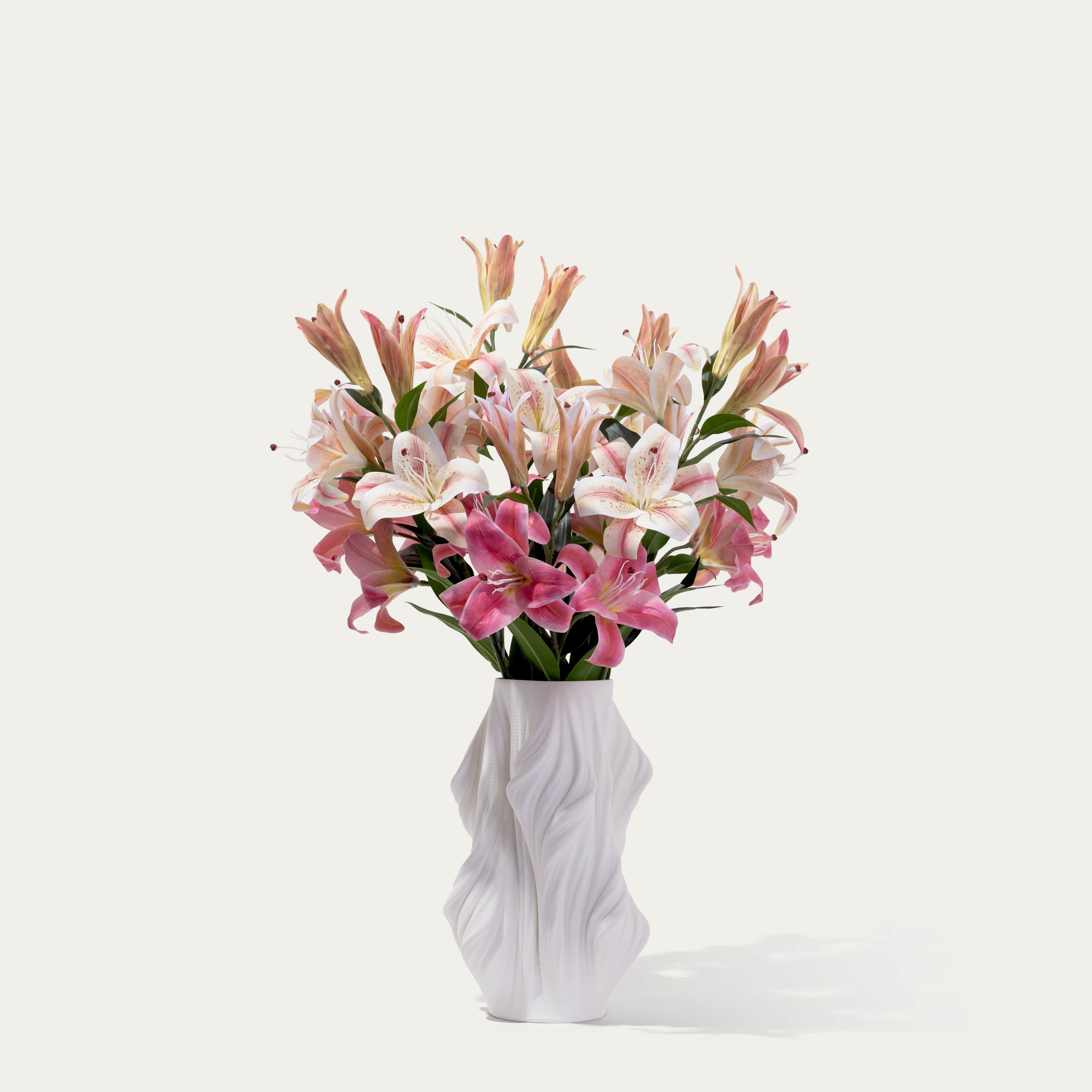 Mono bouquet of light and dark pink silk lilies in real-touch quality. Beautifully arranged in a large organically shaped white vase. The bouquet comes with our complementary floral scent.