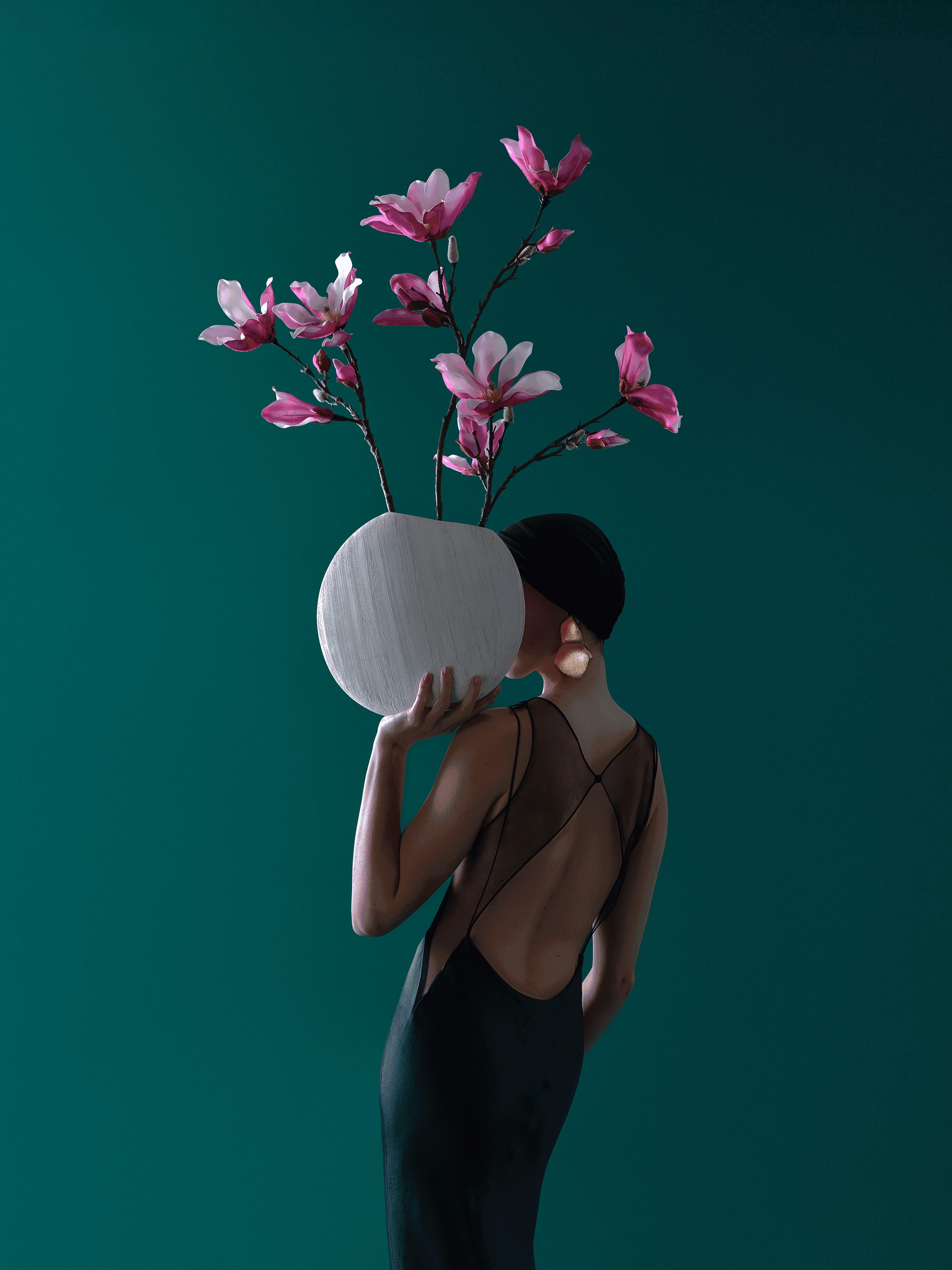 This refined magnolia bouquet forms a graceful composition with its round, softly flattened vase. This bouquet comes with our complimentary floral perfume.