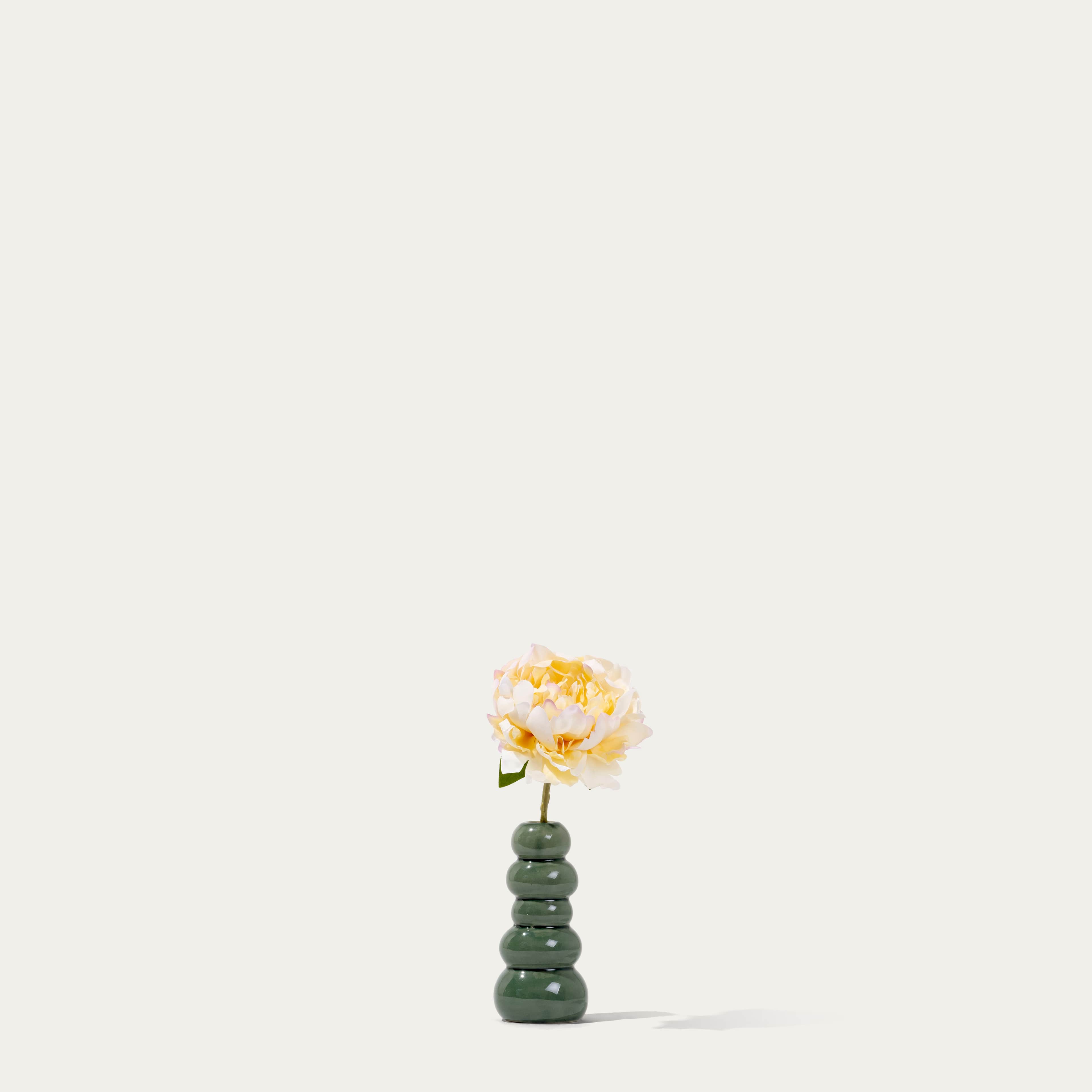 Our collection of gorgeous single silk flowers in a small organic table vase. The perfect gift or pick-me-up for your own space. All Minis come with vase and our complementary floral scent.