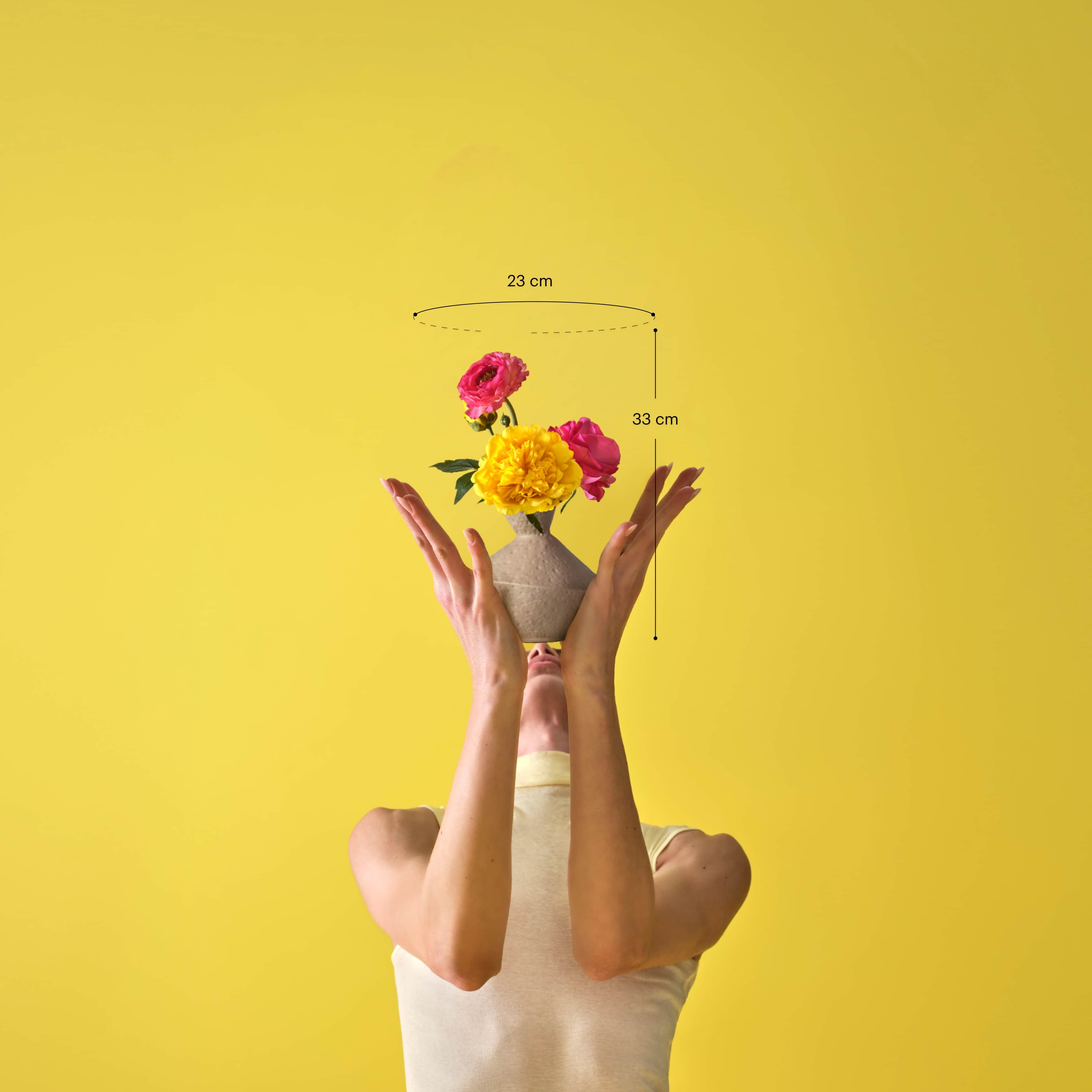 A delicate silk bouquet featuring real-touch yellow peony, pink ranunculus and hot pink rose, arranged in an organic vase. The bouquet comes with our complementary floral scent.
