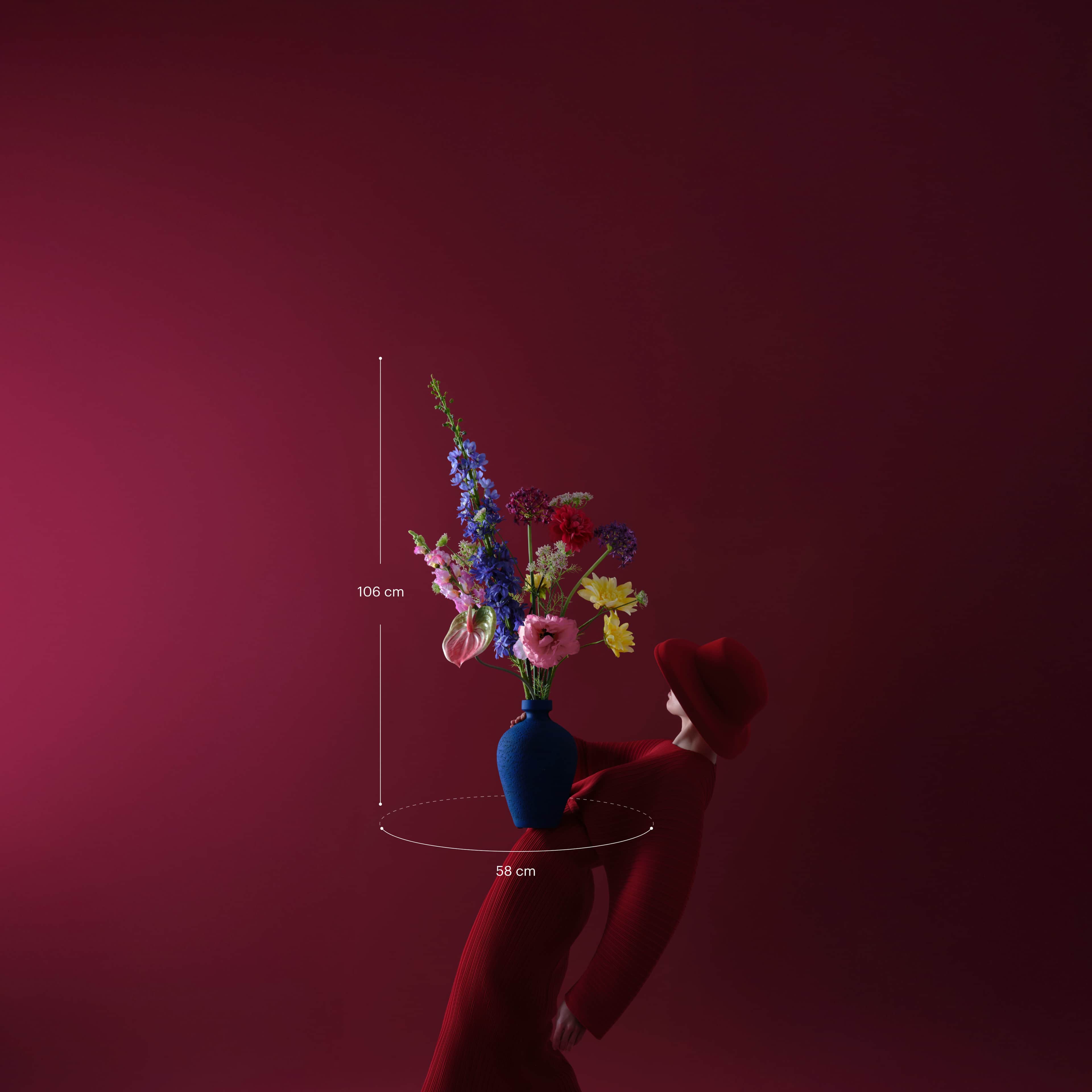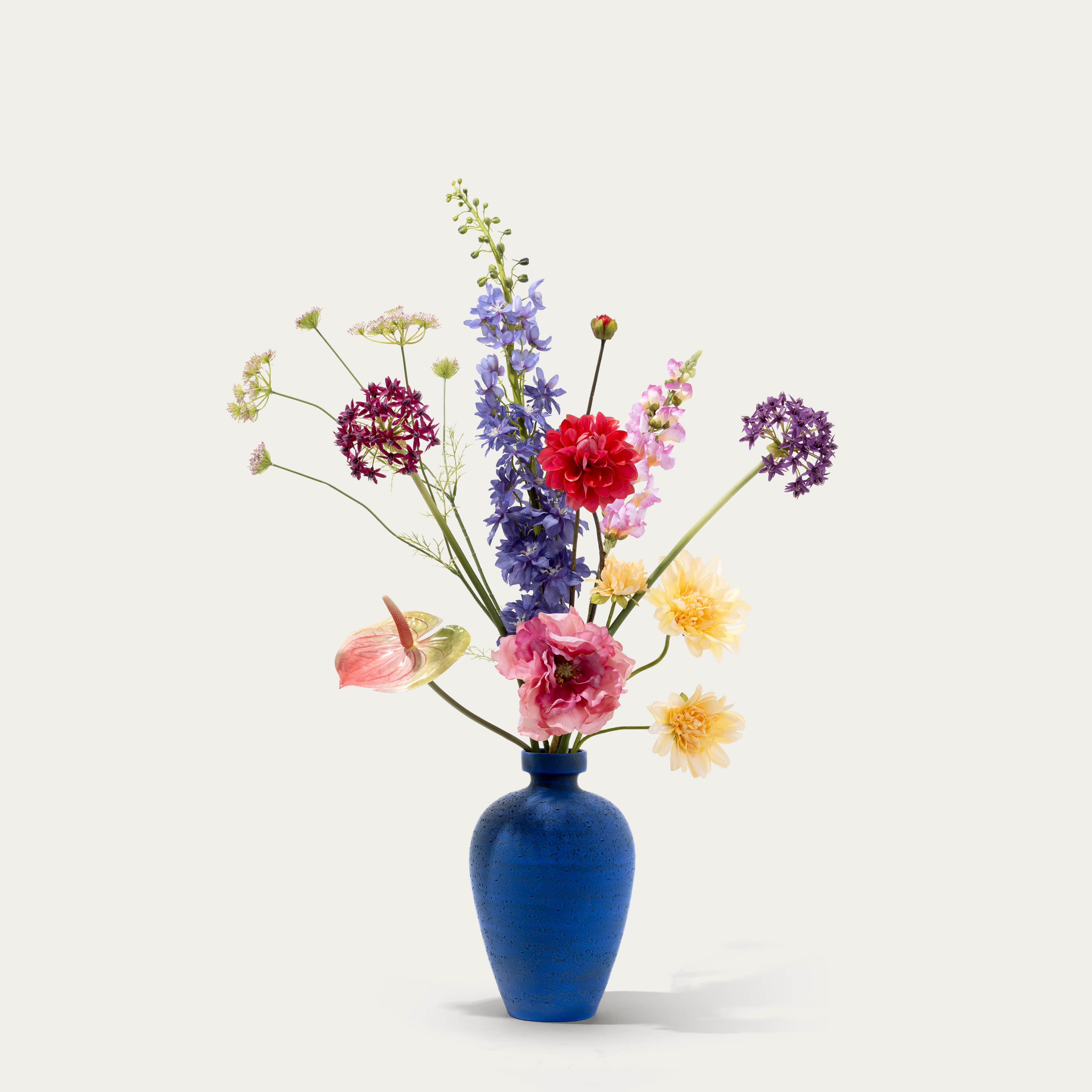 A striking floral composition where bold hues meet an unexpected vase pairing, featuring blue delphinium, yellow dahlia, and pink poppy. This bouquet comes with our complimentary floral scent.
