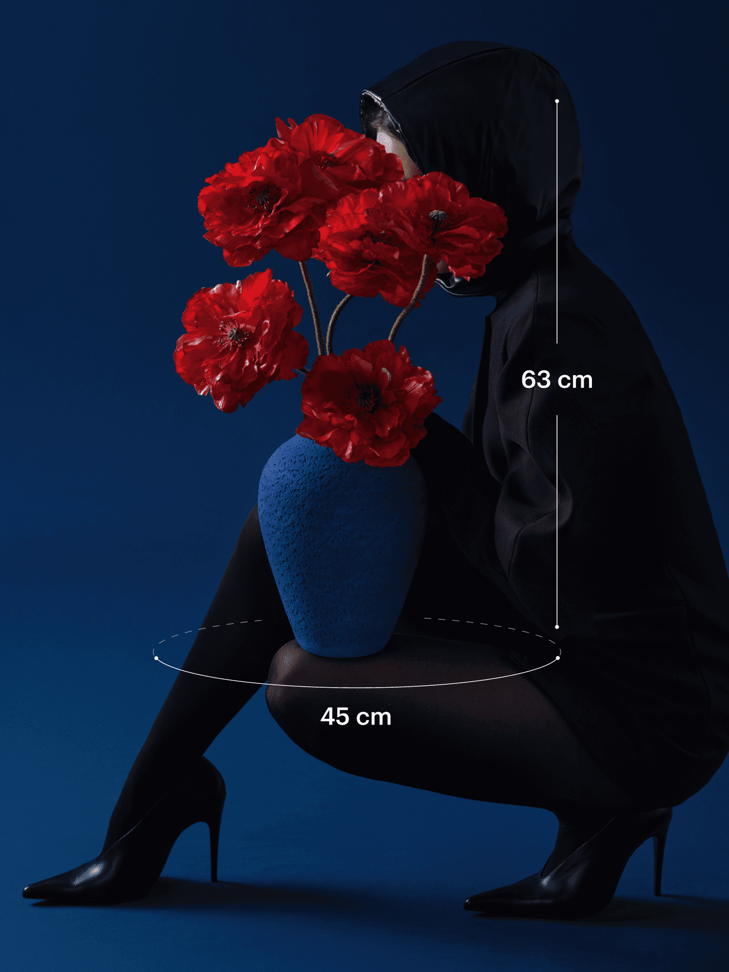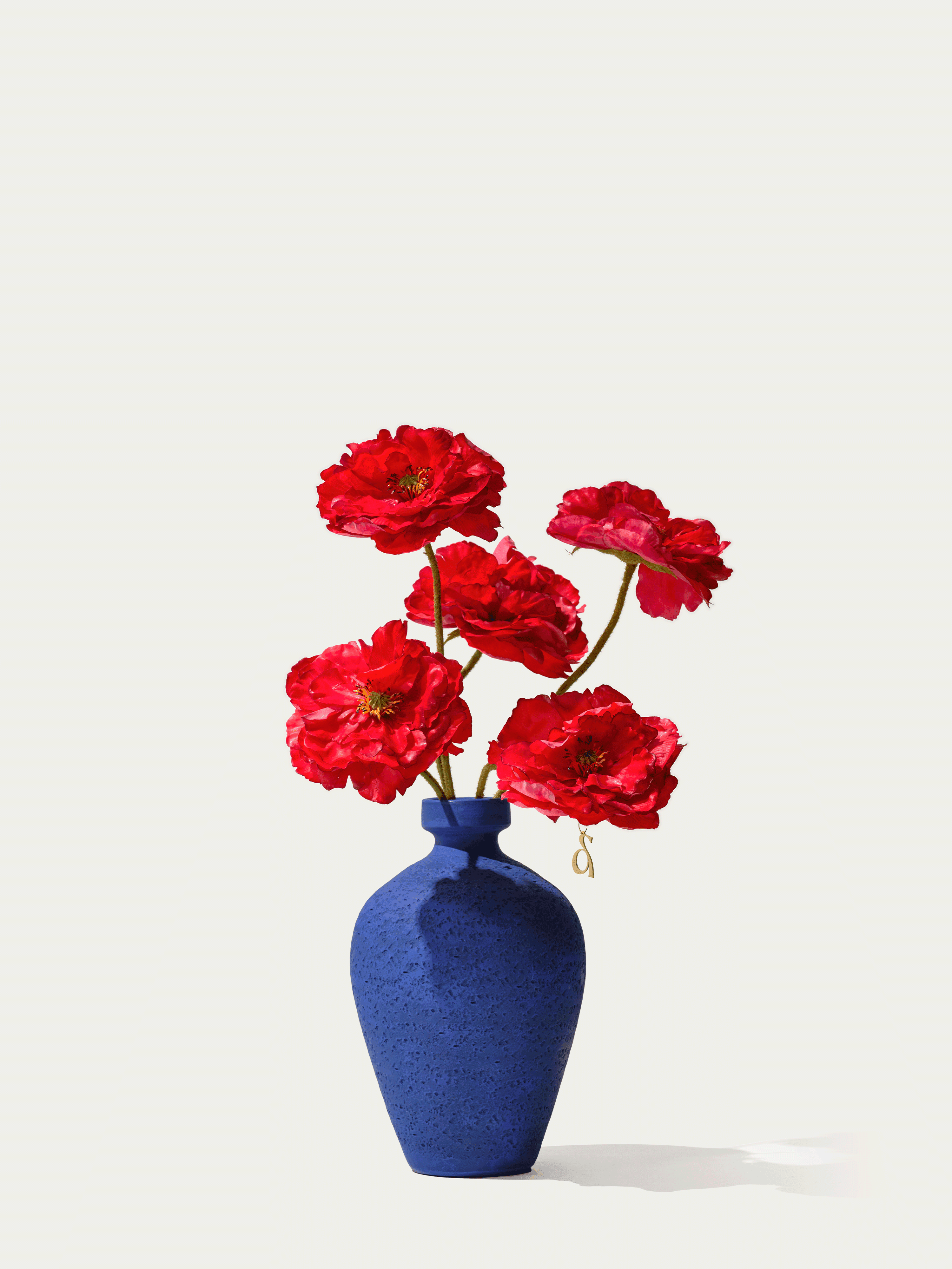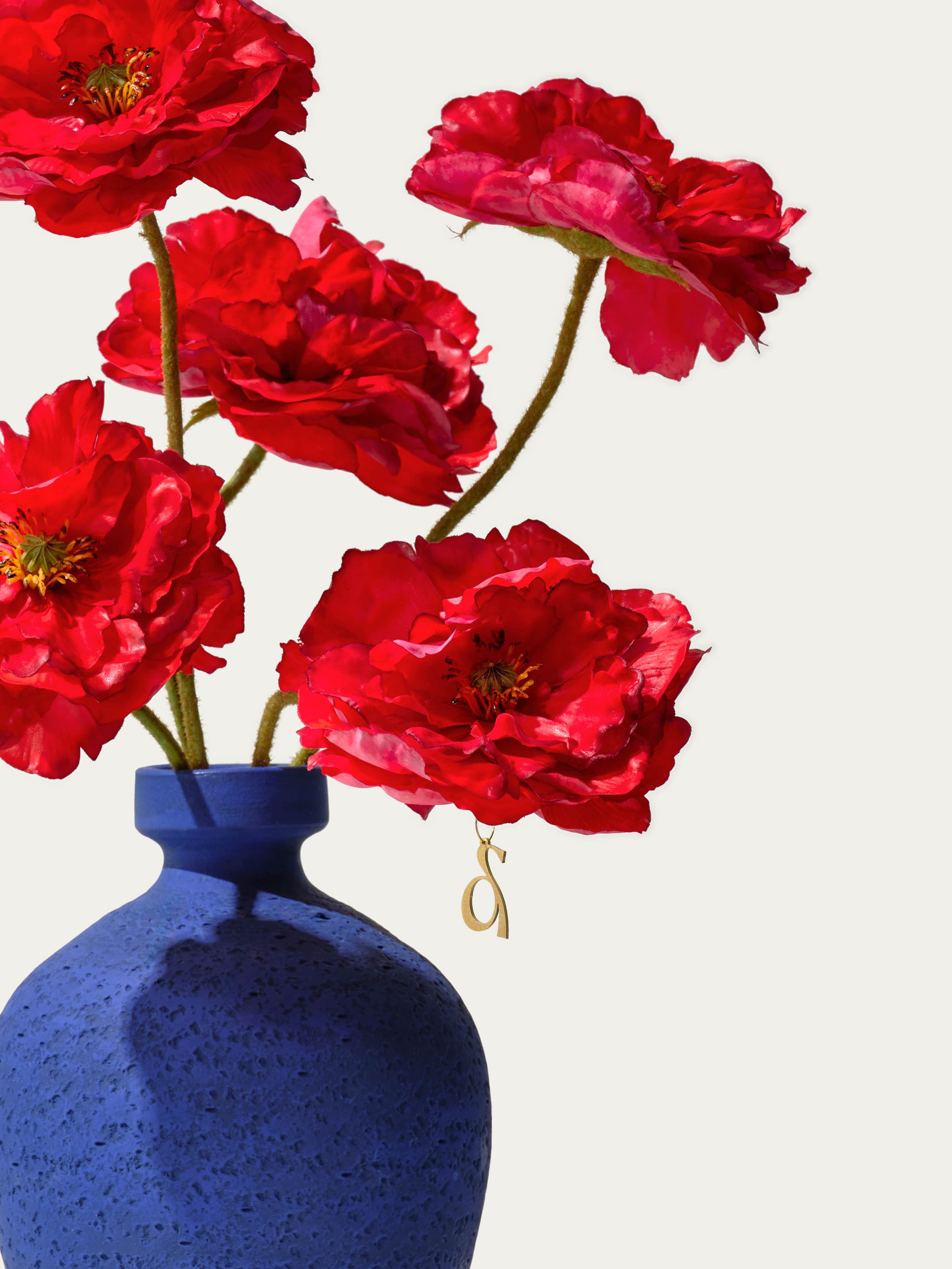 This bold bouquet featuring gorgeous silk poppies makes a striking statement with its blue stone vase. The bouquet comes with our complementary floral scent.