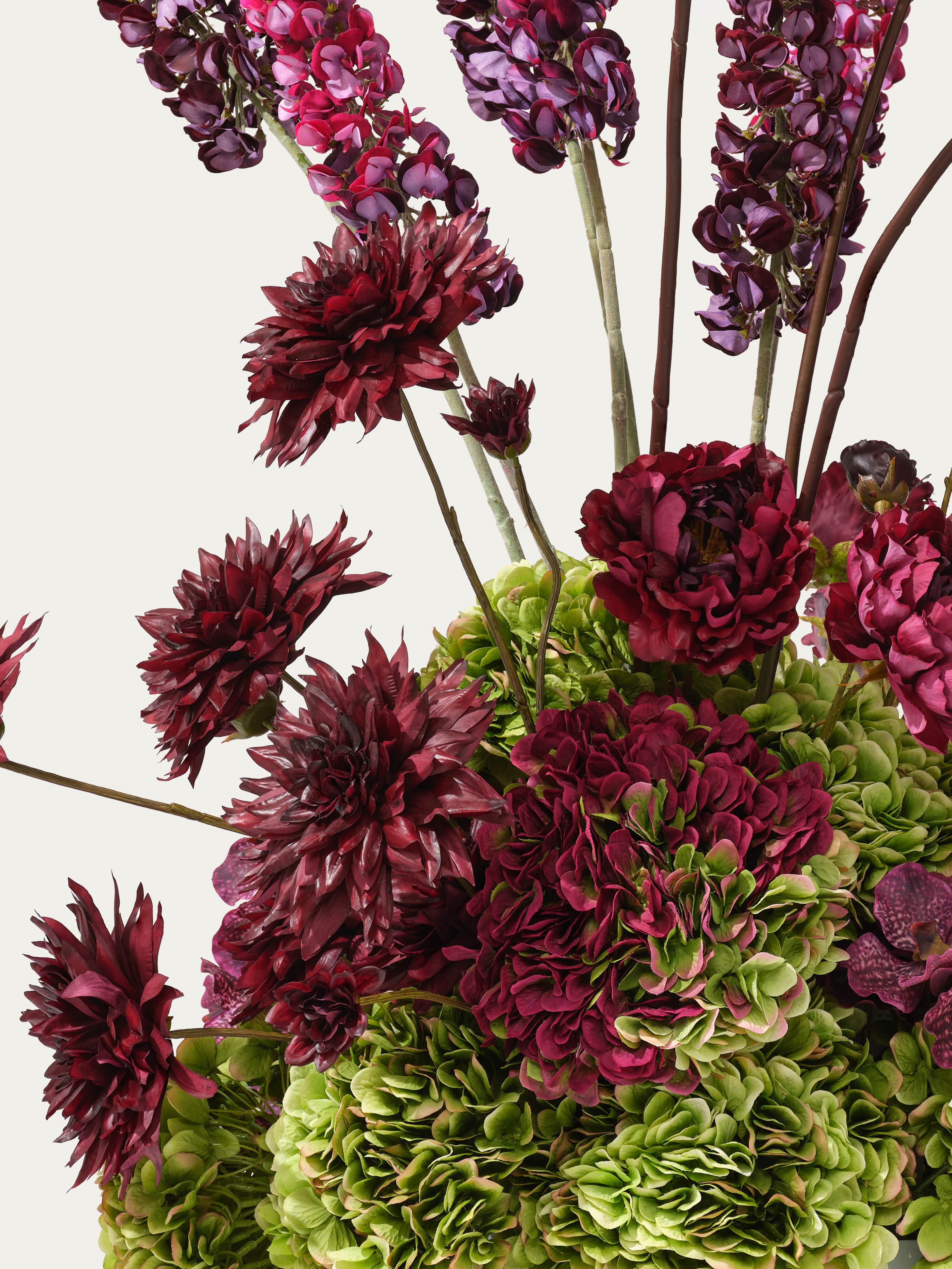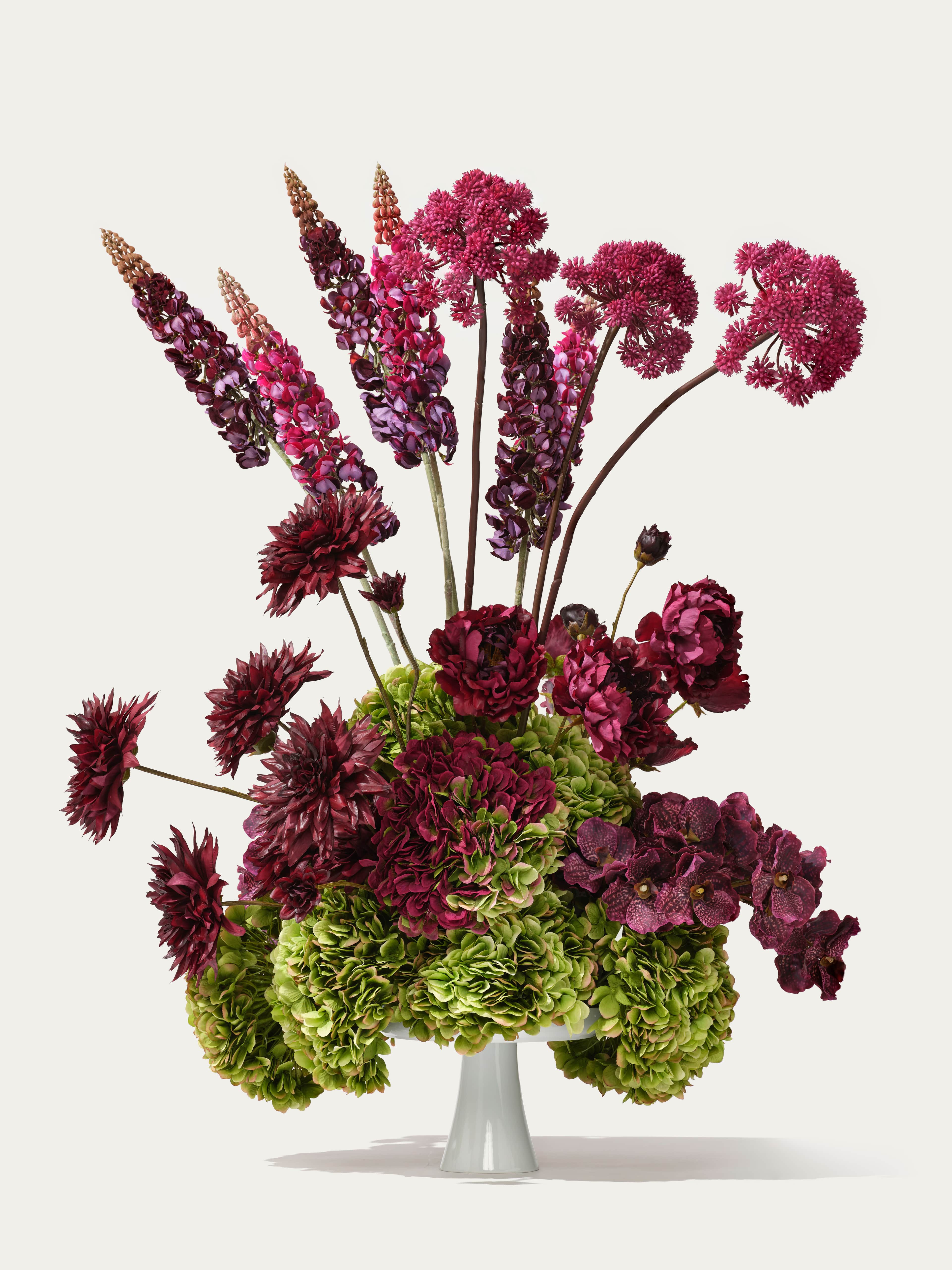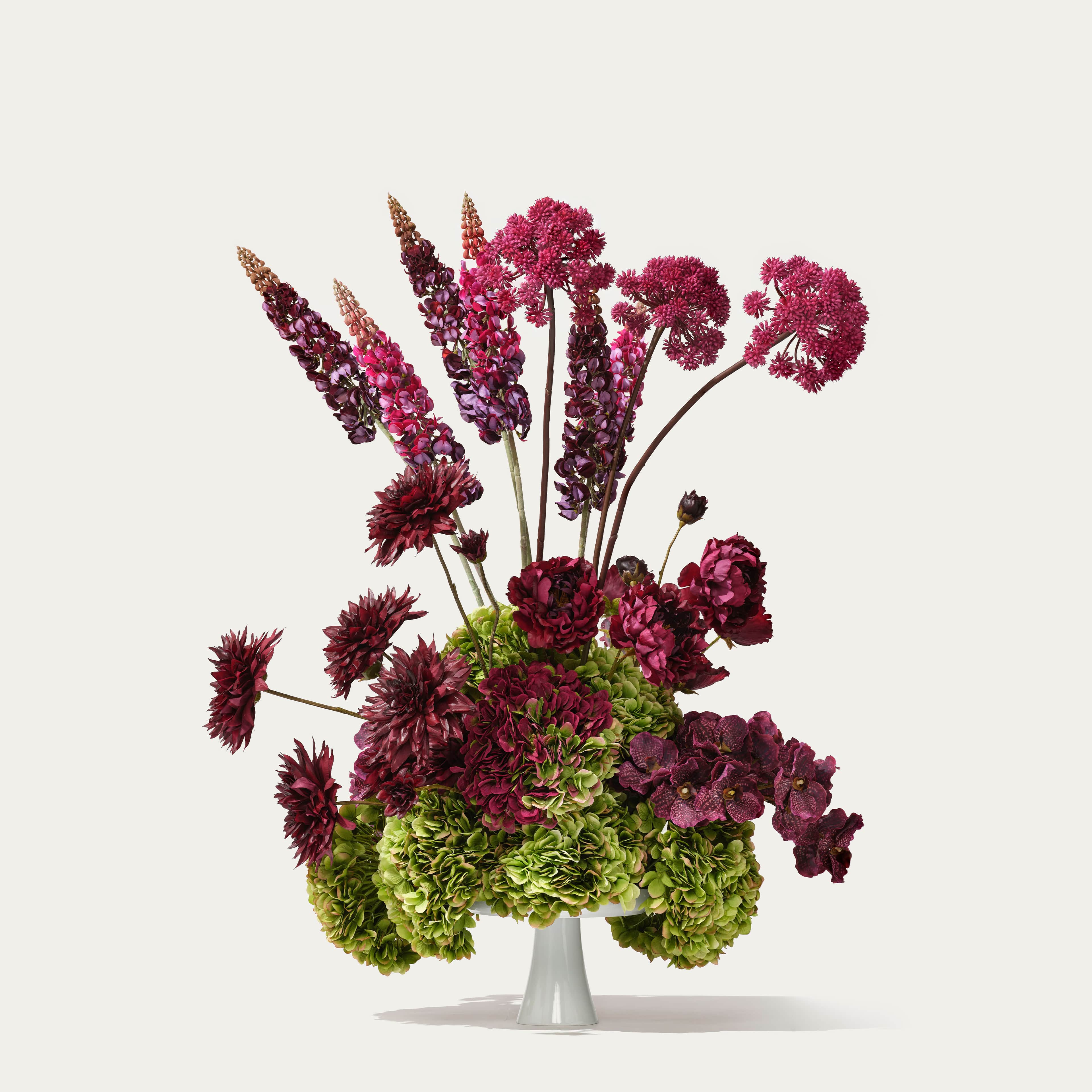 Our pride of the season: this grand sculpture of multicolored hydrangeas, lupine, angelica, real-touch burgundy dahlia, vanda, peony, and poppy, offers an unforgettable display. Comes with our complementary floral scent.