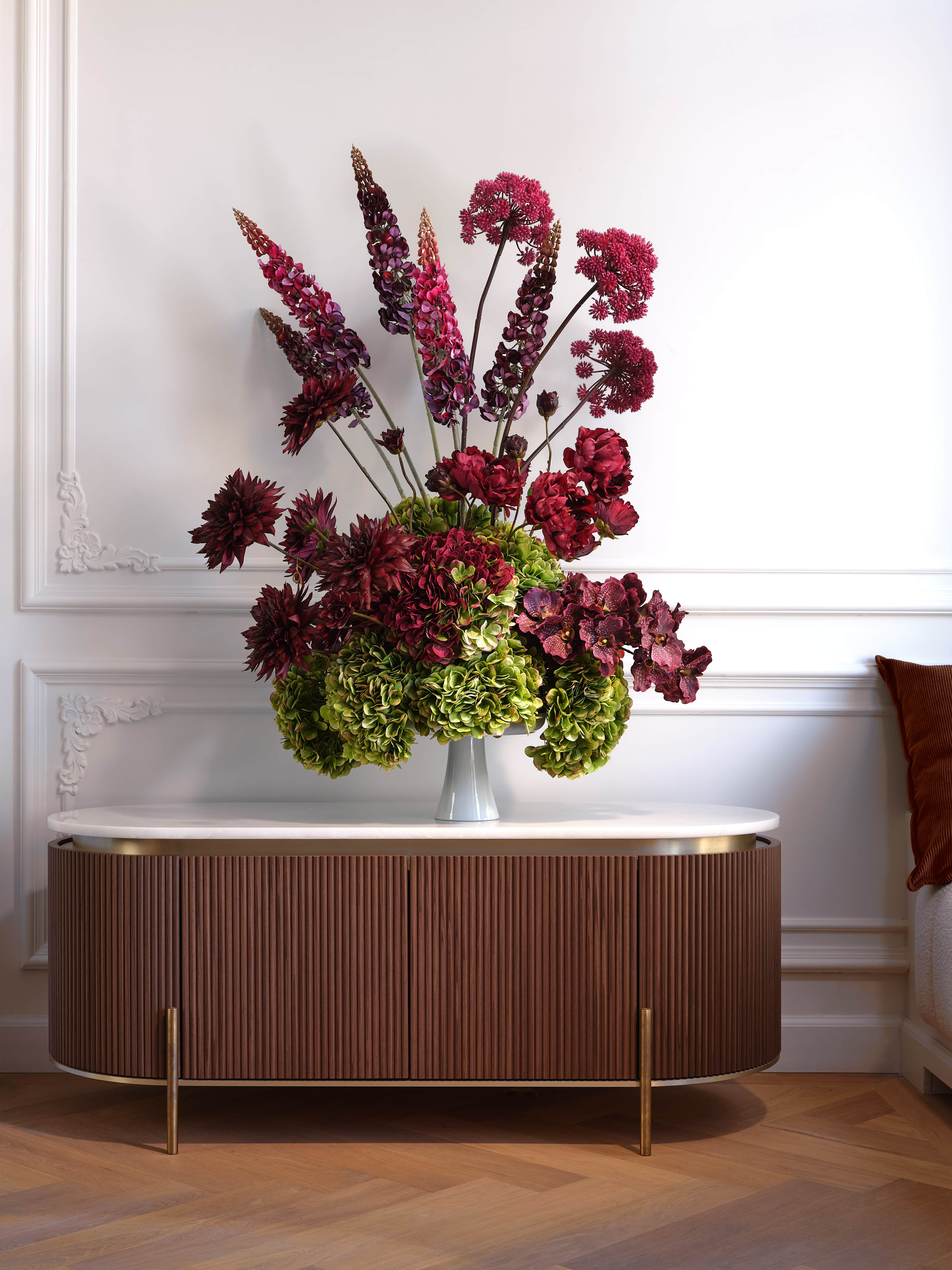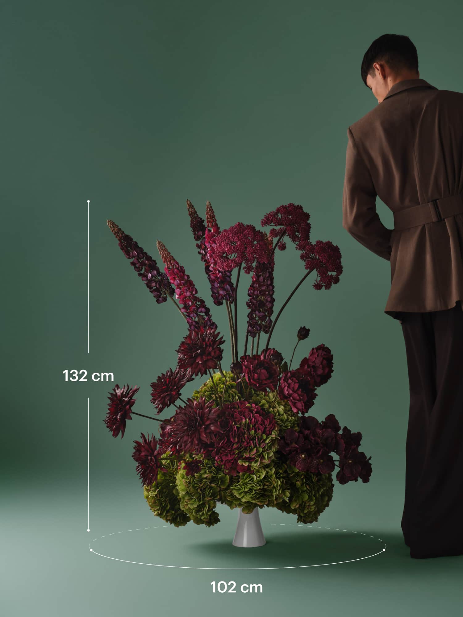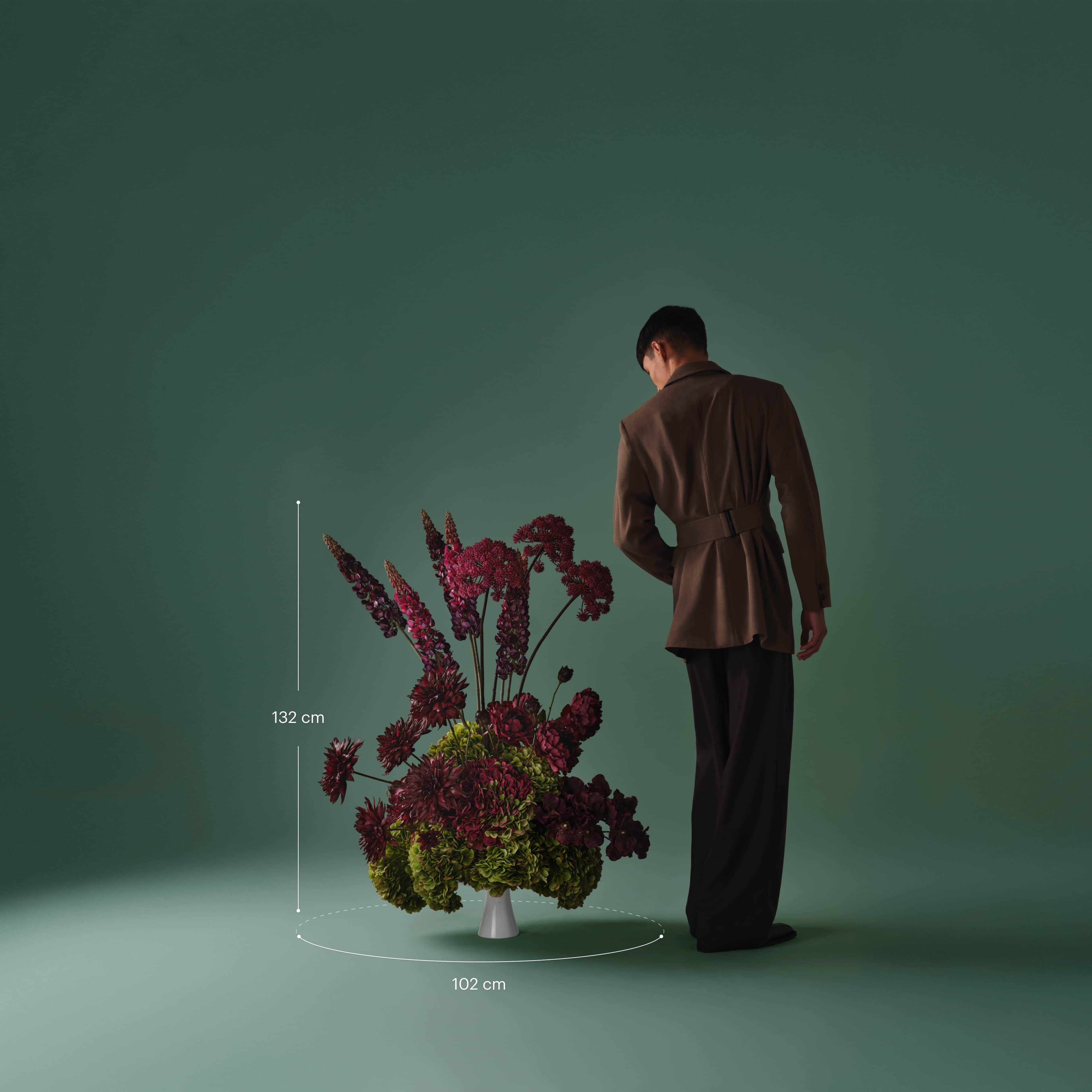 Our pride of the season: this grand sculpture of multicolored hydrangeas, lupine, angelica, real-touch burgundy dahlia, vanda, peony, and poppy, offers an unforgettable display. Comes with our complementary floral scent.