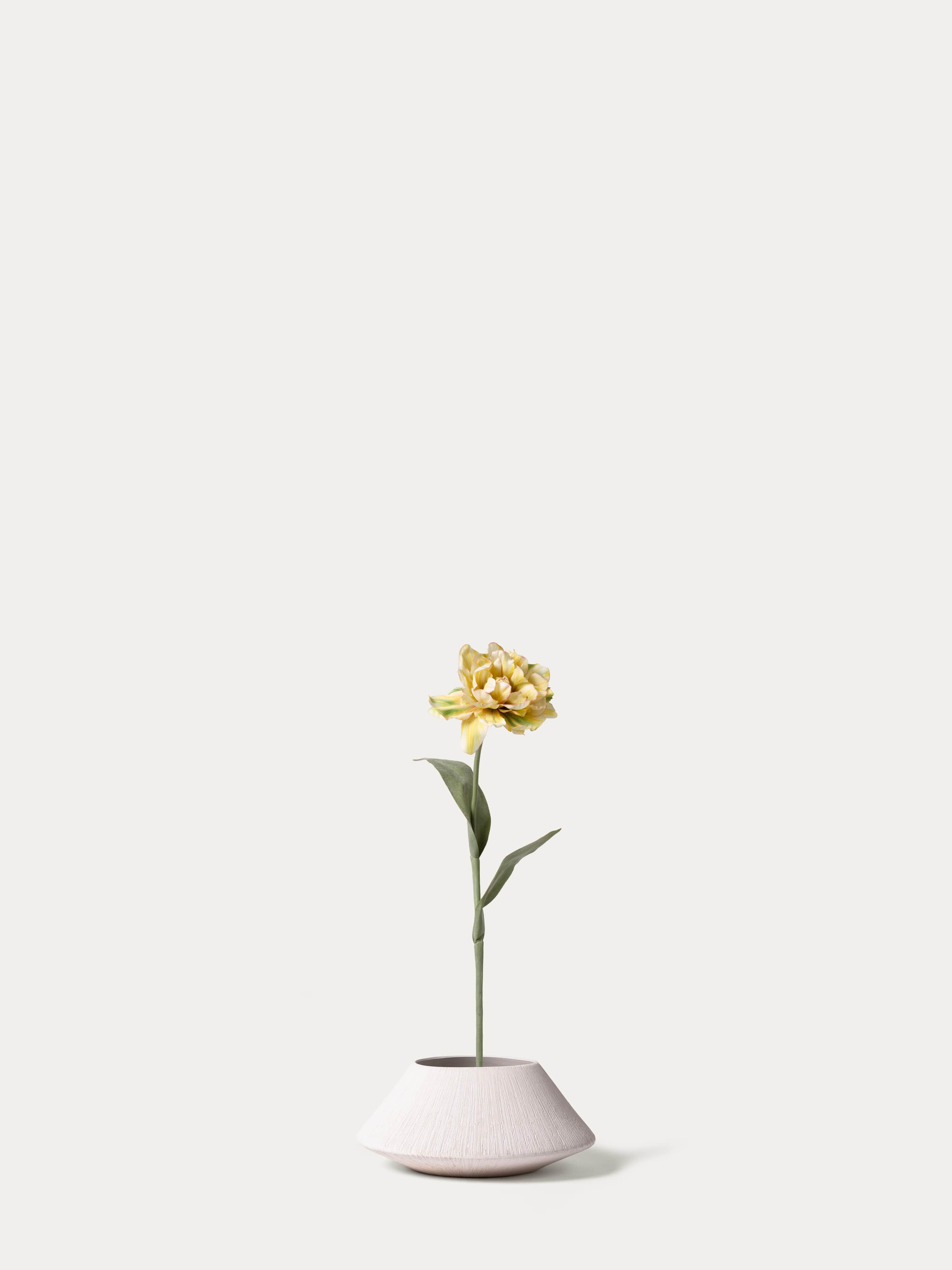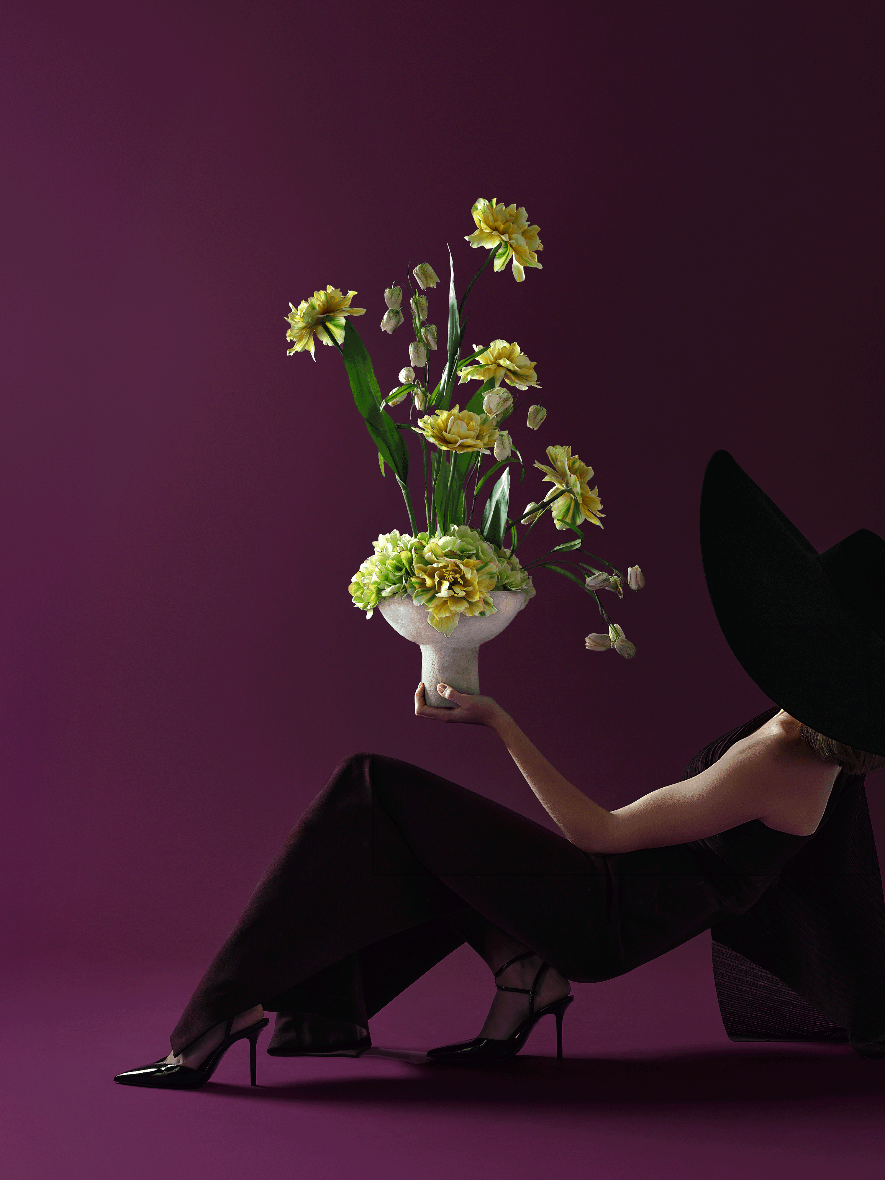 An unexpected and refined sculpture with yellow silk peony tulips, hydrangea, and fritillaria. This sculpture comes with our complimentary floral scent.