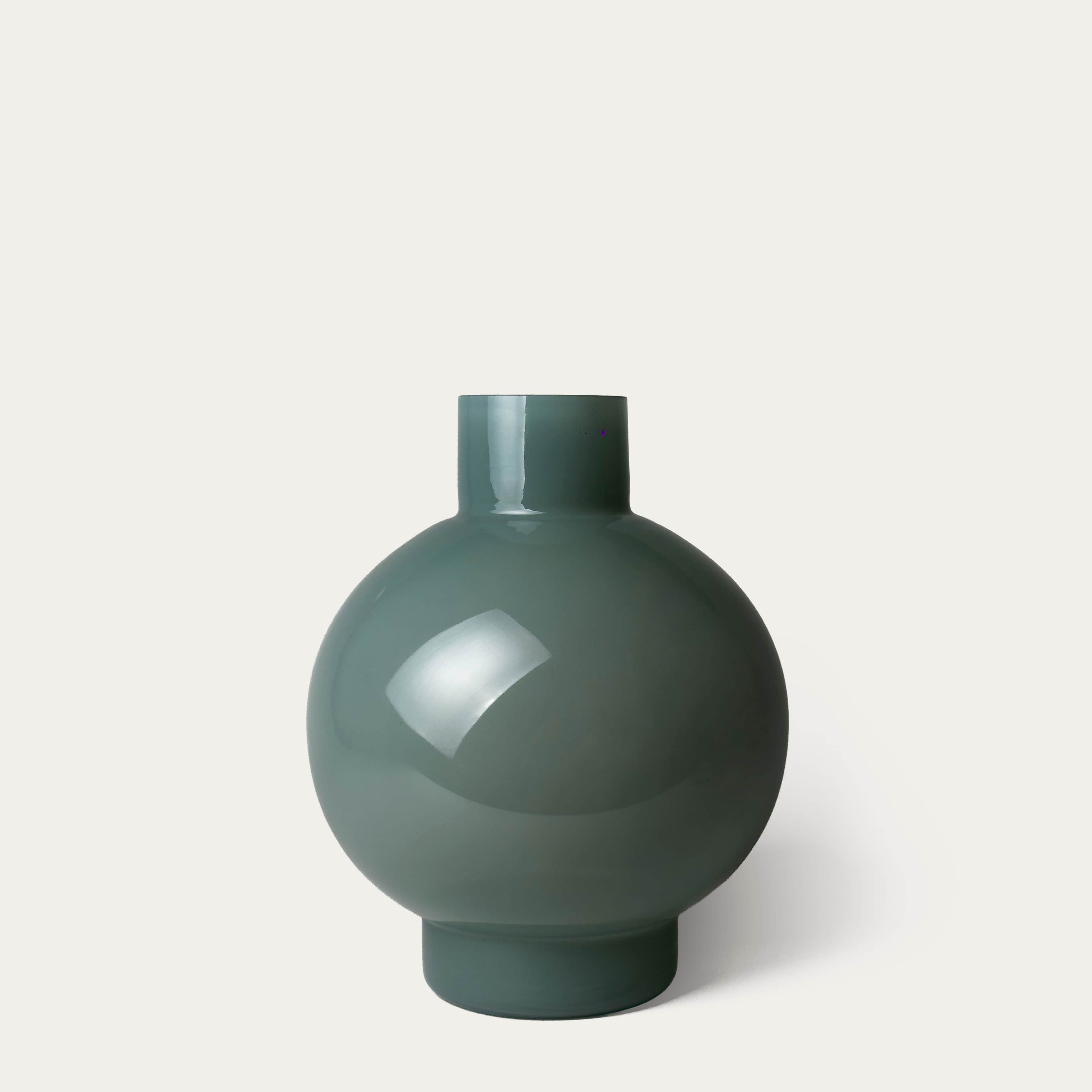 Een ronde glazen vaas met een zachte grijze kleur. Rustig en tijdloos; de vorm geeft je boeket een mooi, natuurlijk accent.