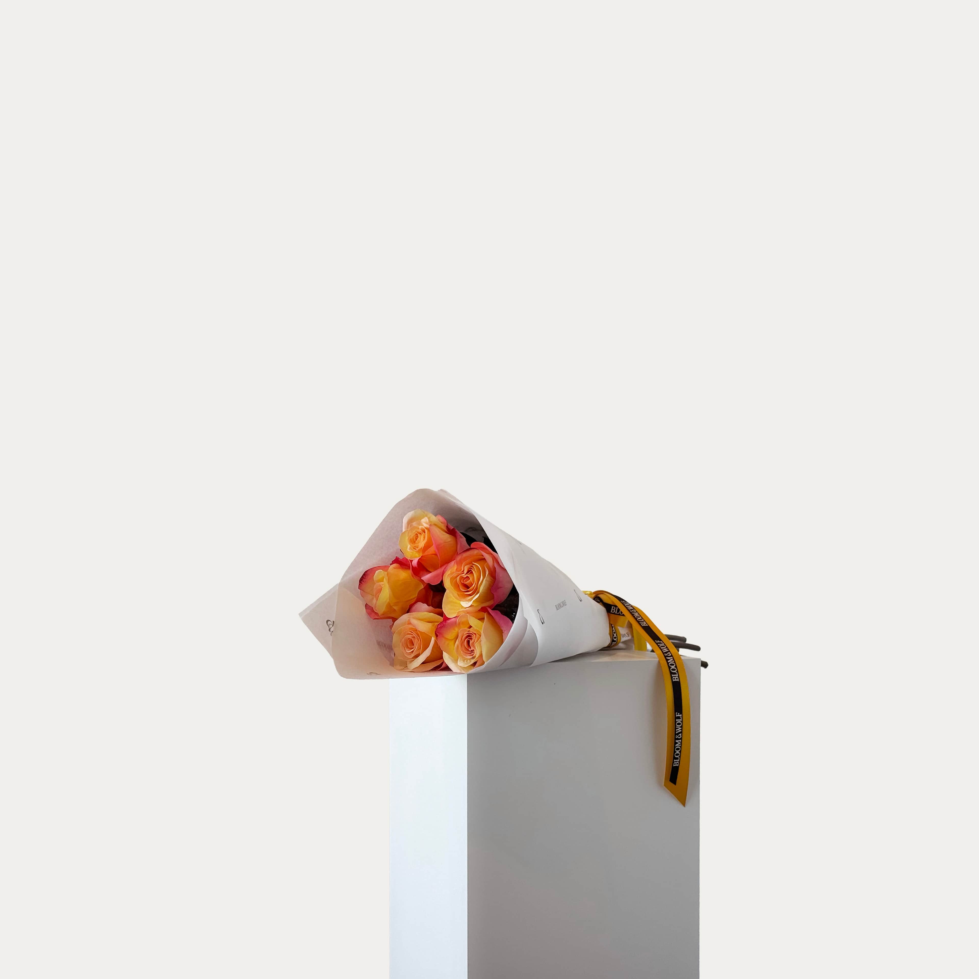Luxueus boeket van vijf prachtige real-touch rozen: perfect voor Moederdag. Dit boeket wordt geleverd met ons gratis bloemparfum.