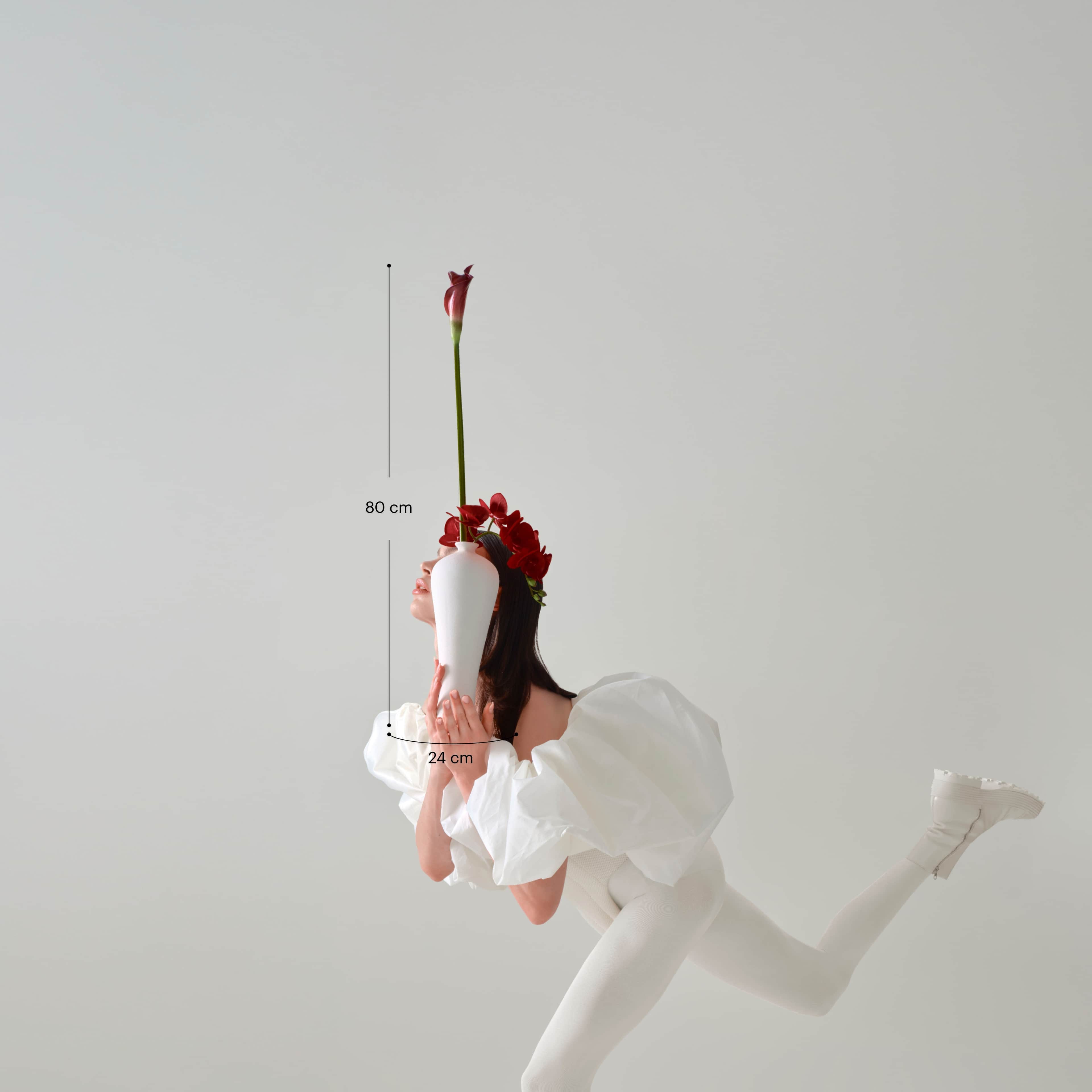 Een elegant klein zijden boeket met real-touch dieprode phalaenopsis orchidee en een bordeaux calla, geschikt in een hoge, vrouwelijke witte vaas. Het boeket wordt geleverd met ons gratis bloemparfum.