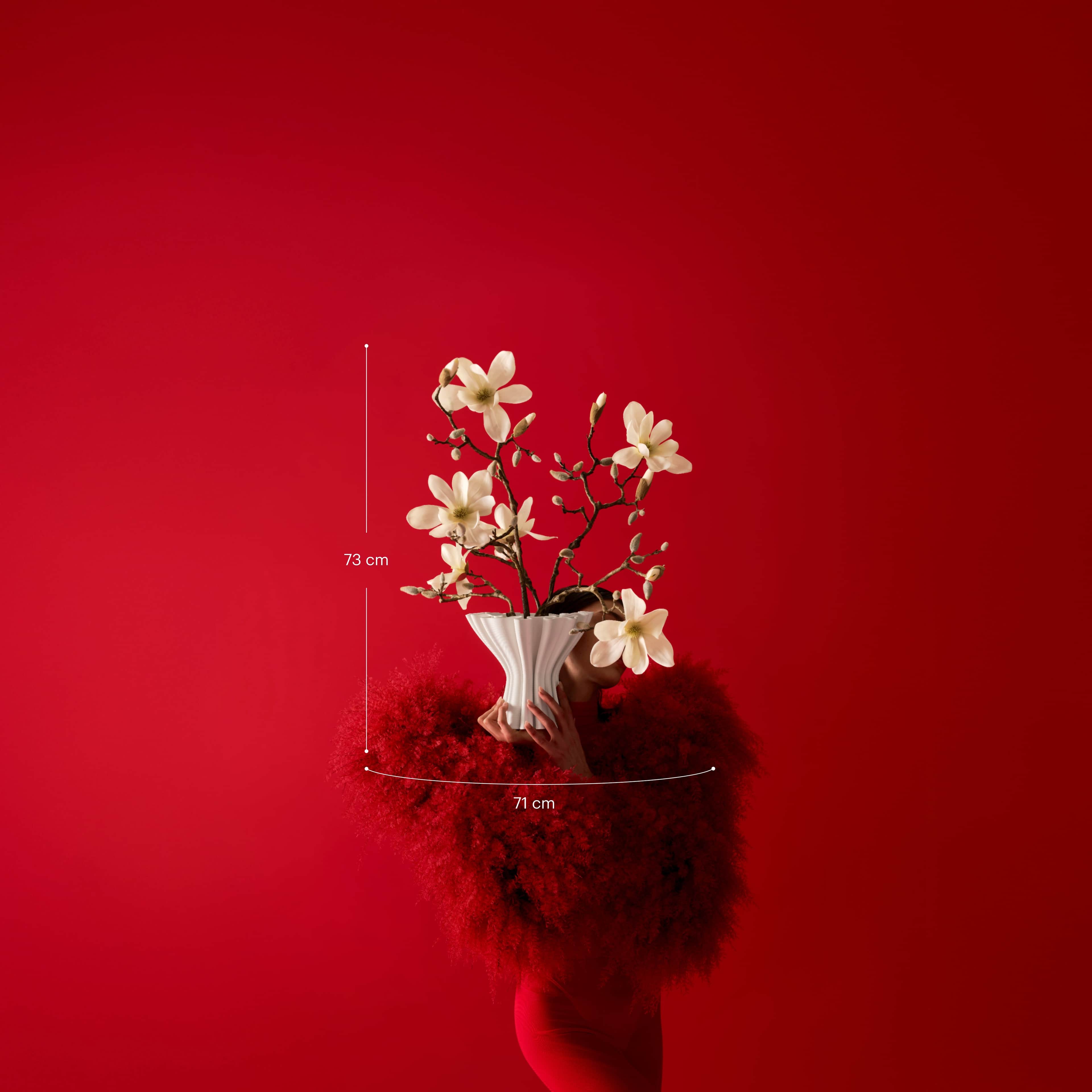 Een dramatisch zijden boeket met witte magnoliatakken, geschikt in een prachtige witte organische vaas. Het boeket wordt geleverd met ons gratis bloemparfum.
